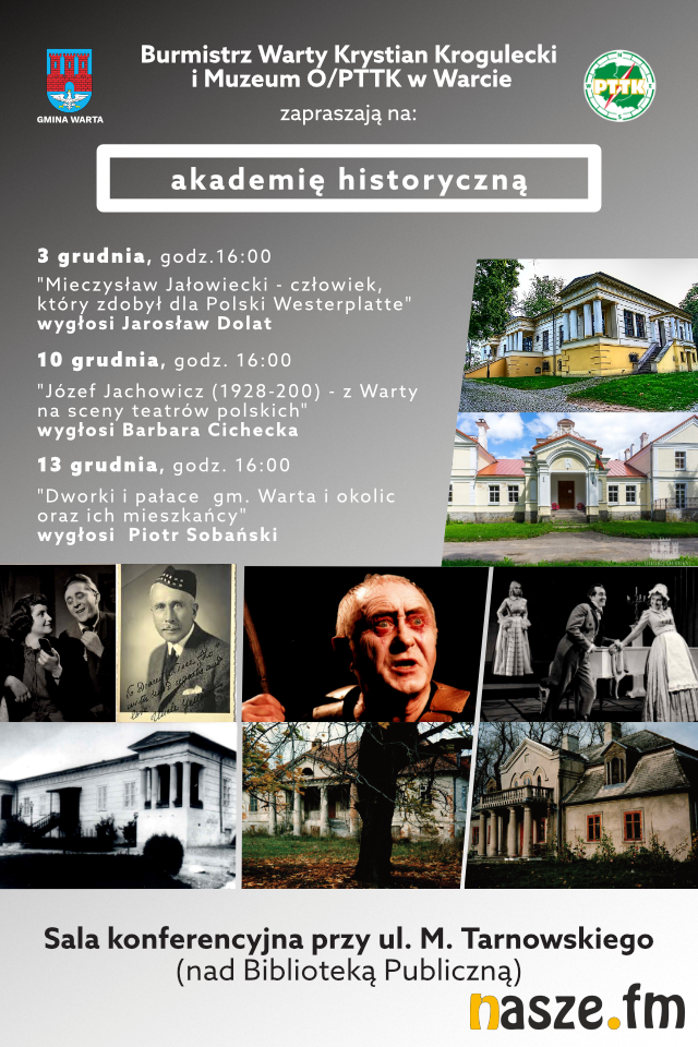 Na Akademię Historyczną zapraszają Burmistrz Warty Krystian Krogulecki i Muzeum O/PTTK w Warcie. Wydarzenie odbędzie się o godzinie 16 w Sali Konferencyjnej przy ul. M. Tarnowskiego (nad Biblioteką Publiczną w Warcie). wstęp wolny.