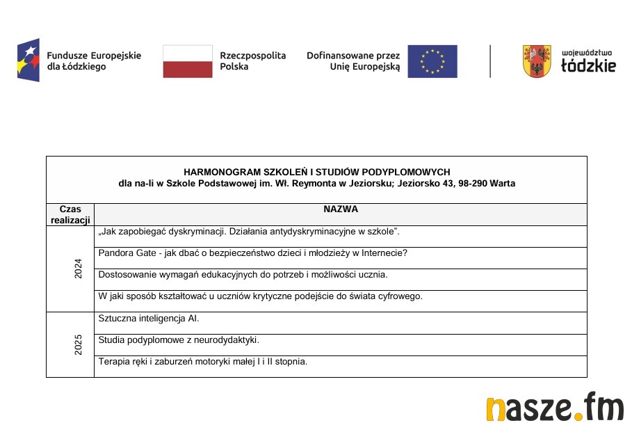 Burmistrz Warty Krystian Krogulecki podpisał umowę, na mocy której Szkoła Podstawowa im. Wł. Reymonta w Jeziorsku otrzymała dofinansowanie w wysokości 509 784,98 zł na realizację projektu „Szkoła w Jeziorsku na drodze rozwoju”. Projekt jest współfinansowany ze środków Europejskiego Funduszu Społecznego Plus w ramach Programu Regionalnego Fundusze Europejskie dla Łódzkiego 2021-2027 nr FELD.08.07-IZ.00-0174/24-00 realizowanego w Szkole Podstawowej im. Wł. Reymonta w Jeziorsku realizowanego w okresie od 01.10.2024 do 31.08.2025.