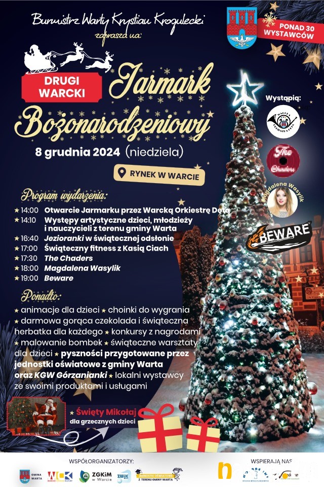 Trwa drugi Warcki Jarmark Bożonarodzeniowy. W programie m.in. występy artystyczne, świąteczne warsztaty, animacje dla dzieci oraz spotkanie ze Świętym Mikołajem. Uwaga! Na czas wydarzenia Rynek w Warcie jest wyłączony z ruchu. Został wyznaczony objazd.