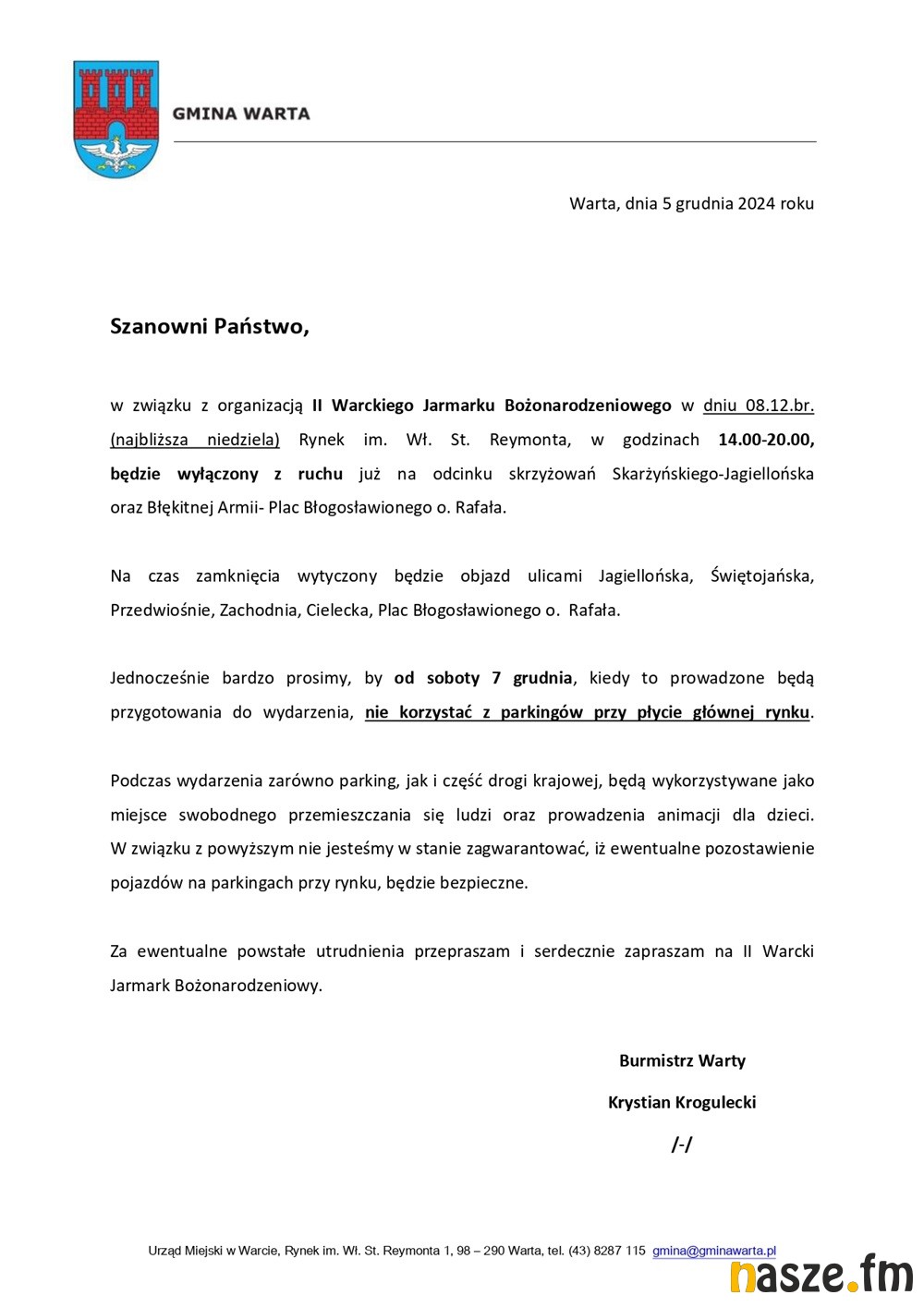 Za ewentualne powstałe utrudnienia przepraszam i serdecznie zapraszam na II Warcki Jarmark Bożonarodzeniowy- przekazuje Krystian Krogulecki burmistrz Warty