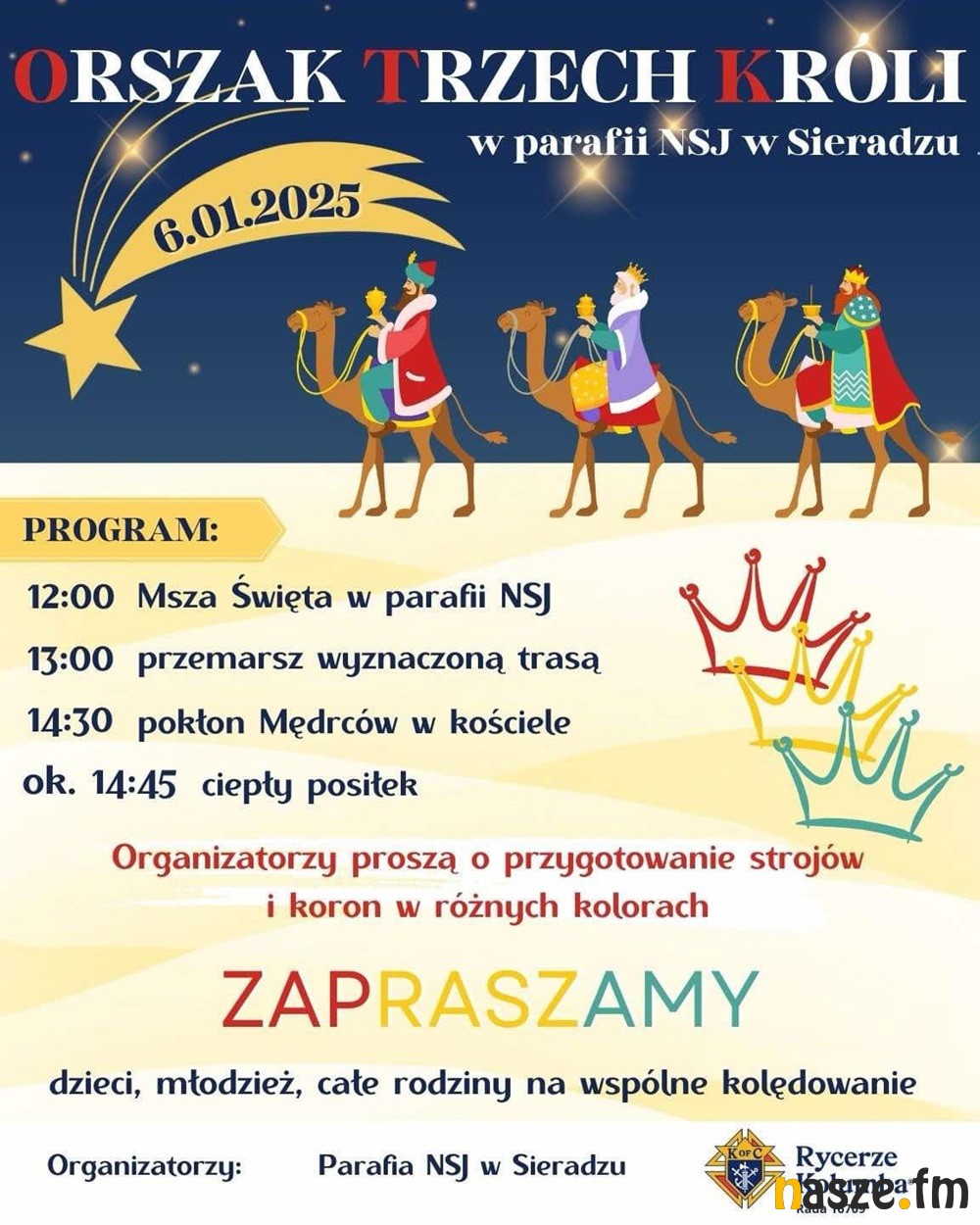 Orszak Trzech Króli wyruszy także z parafii Najświętszego Serca Jezusowego w Sieradzu. Rozpocznie się on mszą świętą o godz. 12:00, a po jej zakończeniu, około 13:00 wyruszy na ulice Sieradza. Trasa orszaku: Grunwaldzka, Reymonta, Braterstwa Broni, Armii Krajowej, rozpoczynając i kończąc w kościele NSJ.