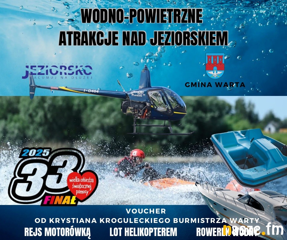 - Voucher na wodno-powietrzne atrakcje nad Jeziorskiem, w tym rejs motorówką, lot helikopterem i rowerek wodny.