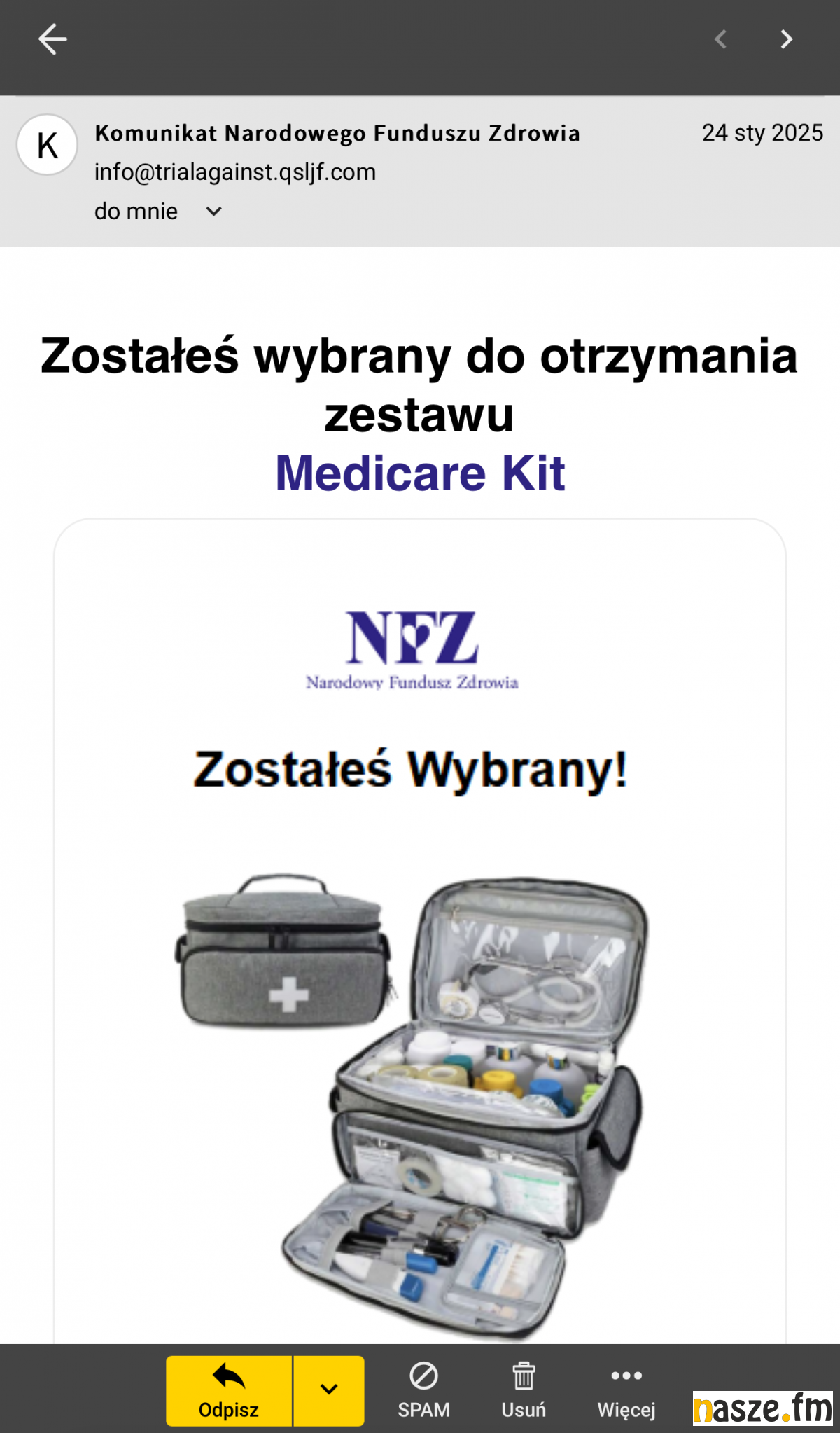 Cyberprzestępcy podszywają się pod Narodowy Fundusz Zdrowia. Wysyłają e-maile z ofertą otrzymania dobrze wyposażonej "darmowej apteczki". Nadawcą niewinnie wyglądającej wiadomości jest rzekomo NFZ. Uwaga! To fałszywe wiadomości oraz próba wyłudzenia danych i pieniędzy.