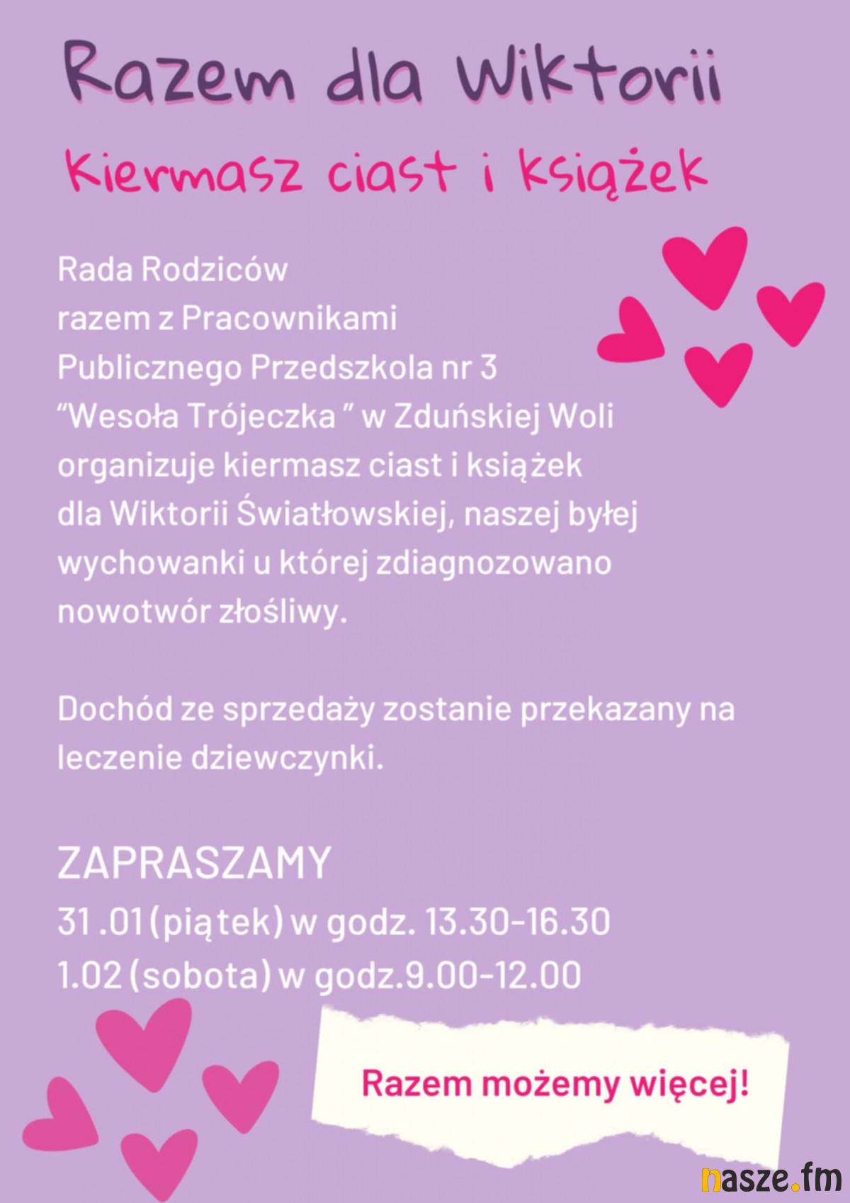 W najbliższy piątek(31 stycznia) i w sobotę (1 lutego) w Publicznym Przedszkolu nr 3 "Wesoła Trójeczka" w Zduńskiej Woli odbędzie się kiermasz ciast i książek, z którego cały dochód zostanie przeznaczony na leczenie Wiktorii. W piątek akcja prowadzona będzie w godz. 13:30 - 16:00, natomiast w sobotę w godz. 9:00-12:00.