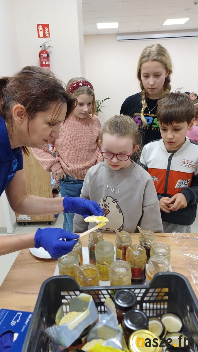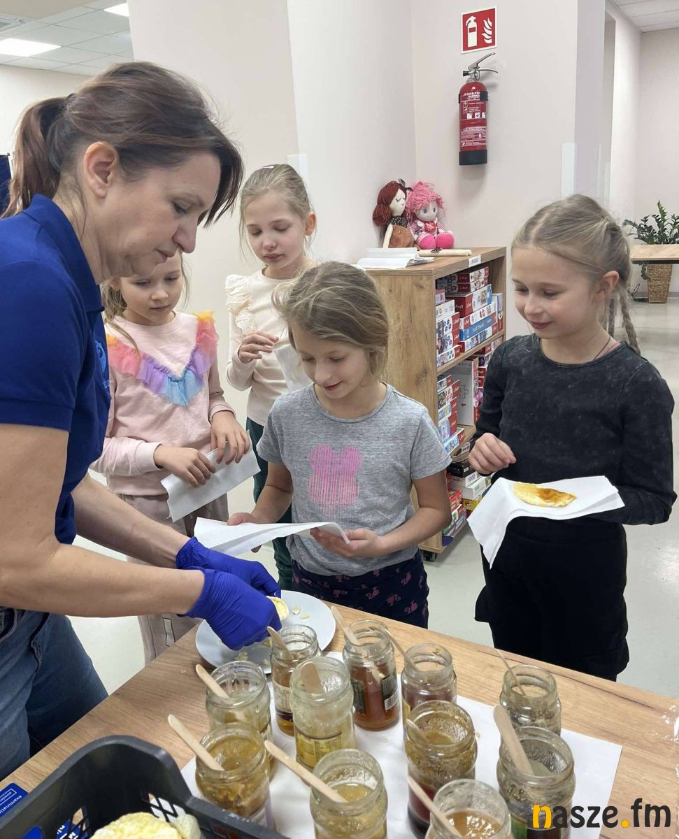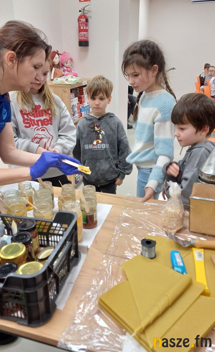 Dzieci biorące udział w zajęciach miały okazję nie tylko dowiedzieć się wielu ciekawostek o pszczołach, przymierzyć strój pszczelarza, spróbować różnych gatunków miodu ale też zrobić własną świeczkę.