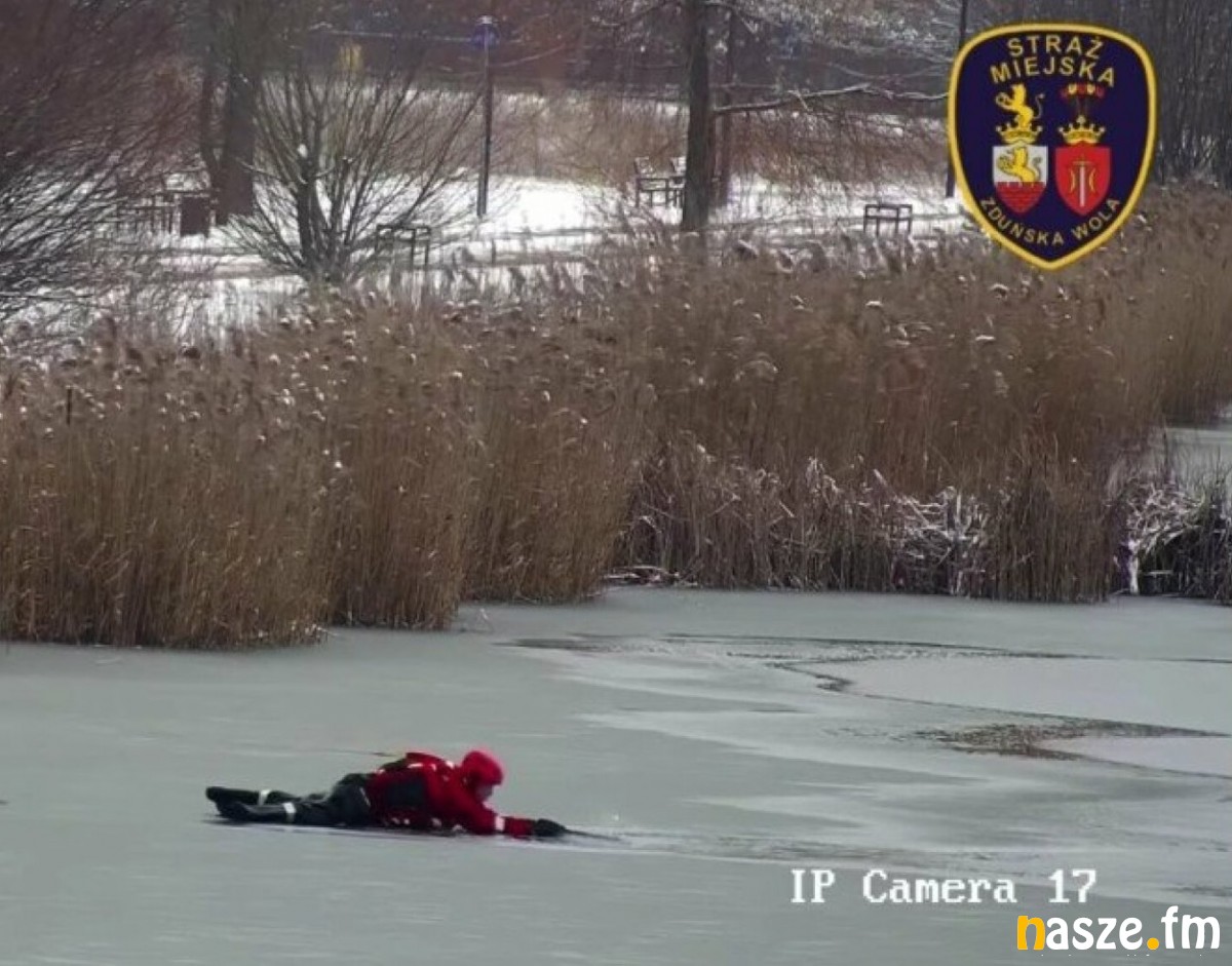 Straż Miejska ze Zduńskiej Woli udostępniła film z akcji ratowania psa, pod którym na zbiorniku Kępina załamał się lód. Widać na nim jak strażak wyciąga zwierzę z wody. Służby apelują o ostrożność.