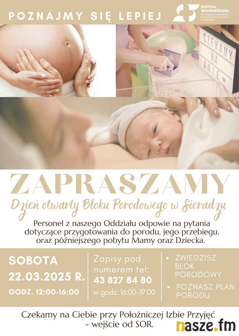 Dzień otwarty bloku porodowego zaplanowano w sobotę 22-go bieżącego miesiąca. Obowiązują wcześniejsze zapisy pod numerem tel. 43 827 84 80 w godz. 16:00-19:00