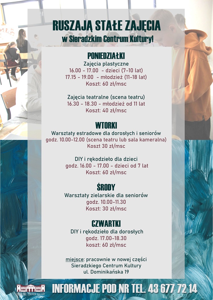 Stałe zajęcia artystyczne dla dzieci, młodzieży, dorosłych i seniorów wystartują już 14 kwietnia. Trwają zapisy na regularne warsztaty plastyczne, teatralne, rękodzielnicze dla dzieci i dorosłych, warsztaty zielarskie i estradowe dla seniorów. W planach są kolejne ciekawe zajęcia oraz wiele zajęć z rożnych dziedzin sztuki i nie tylko. W nowych pracowniach Sieradzkiego Centrum Kultury będzie można rozwijać swoje talenty, pasje i zainteresowania pod czujnym okiem wykwalifikowanych instruktorów. Prace uczestników warsztatów będą regularnie eksponowane w Sieradzkim Centrum Kultury, a efekty zajęć teatralnych i muzycznych będą prezentowane na teatralnej scenie Pracownicy Centrum zachęcają do tego, żeby się zapisywać. Można to robić dzwoniąc pod nr tel 43 677 72 14. Te zajęcia są odpłatne, ich koszt i terminy znajdziecie na plakacie poniżej.
