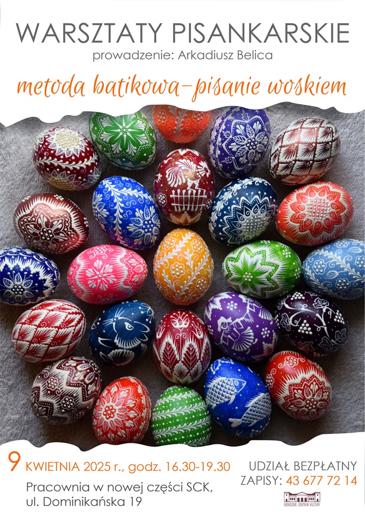 Warsztaty poprowadzi Arkadiusz Belica, twórca ludowy z Częstochowy. Jest twórcą zrzeszonym od 2004 roku w Stowarzyszeniu Twórców Ludowych w Lublinie. Od 25 lat zajmuje się tworzeniem pisanek wielkanocnych metodą batikową - woskiem. Jest laureatem czołowych nagród wielu konkursów pisankarskich w Polsce, a przez wiele lat prezentował również swoje prace na międzynarodowych wystawach pisanki w Hamburgu, Hanowerze, Mannheim, Schwezingen, Hameln, Kloster Eberbach, Michelstadt, Erlangen, Gifhorn. Udział w wystawach międzynarodowych pozwolił na stworzenie jednej z większych kolekcji pisanek w Polsce, liczącej ponad 1000 szt. Autorska wystawa "Pisanki ze świata" prezentowana była w Muzeum Etnograficznym w Warszawie, w Muzeum w Gliwicach - Willa Caro, w Ratuszu Muzeum Częstochowskiego oraz wielu ośrodkach kultury w Polsce. Od ponad 20 lat prowadzi pokazy i warsztaty pisankarskie, podczas których przekazuje swoje doświadczenia, krzewiąc piękną polską tradycję związaną ze Świętami Wielkanocnymi.