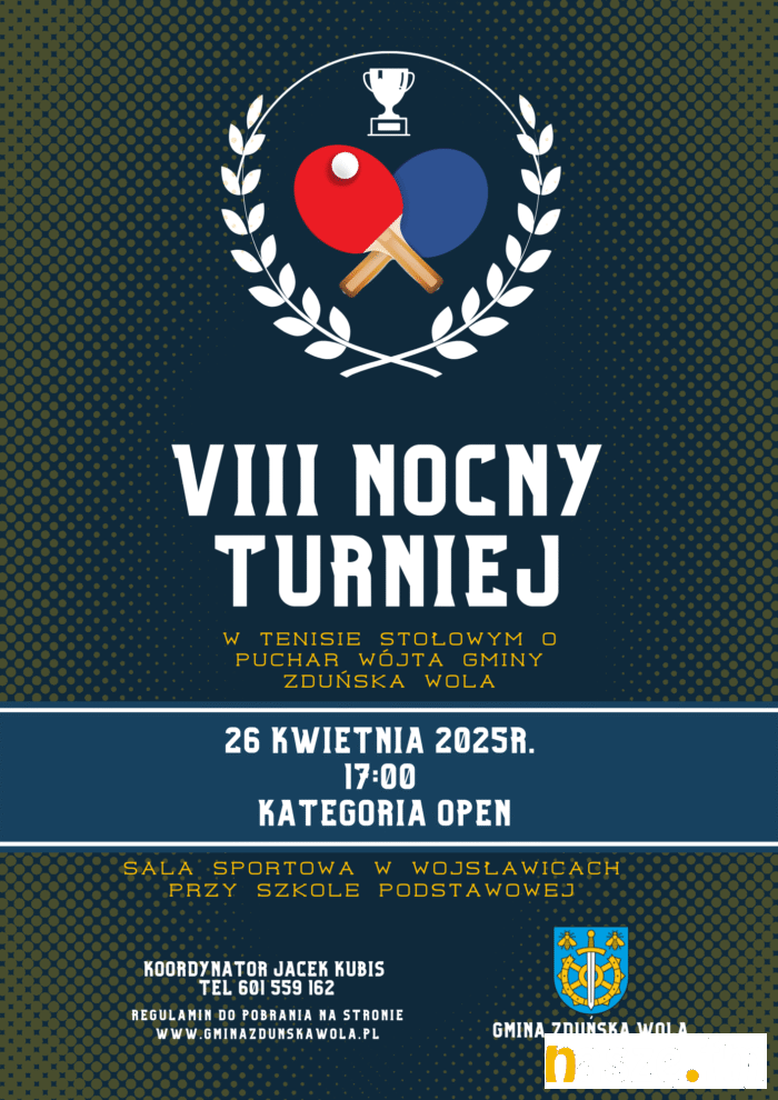 W najbliższą sobotę, 26 kwietnia, odbędzie się VIII edycja Nocnego Turnieju Tenisa Stołowego o Puchar Wójta Gminy Zduńska Wola. Zawody zostaną rozegrane w hali sportowej przy Szkole Podstawowej w Wojsławicach.