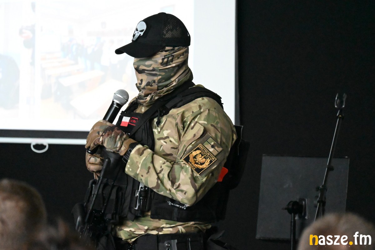 Gdy uczestnicy konferencji przekroczyli próg szkolnej hali sportowej, zamiast standardowych plakatów witały ich… karabiny i pistolety.