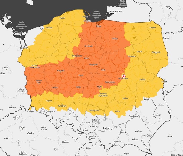 Na mapie poniżej kolorem pomarańczowym zaznaczono obszar naszego kraju objęty ostrzeżeniem drugiego ( w trzy stopniowej skali) stopnia, kolor żółty oznacza ostrzeżenia niższego, pierwszego stopnia.