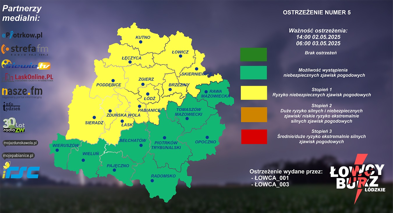 Ostrzeżenia pierwszego stopnia dla części naszego województwa wydali też Łowcy Burz Łódzkie. Ich ostrzeżenie dotyczy powiatów: dla powiatów: sieradzkiego, zduńskowolskiego, łaskiego, pabianickiego, skierniewickiego, łódzkiego-wschodniego, łódzkiego, poddębickiego, łowickiego, łęczyckiego.
