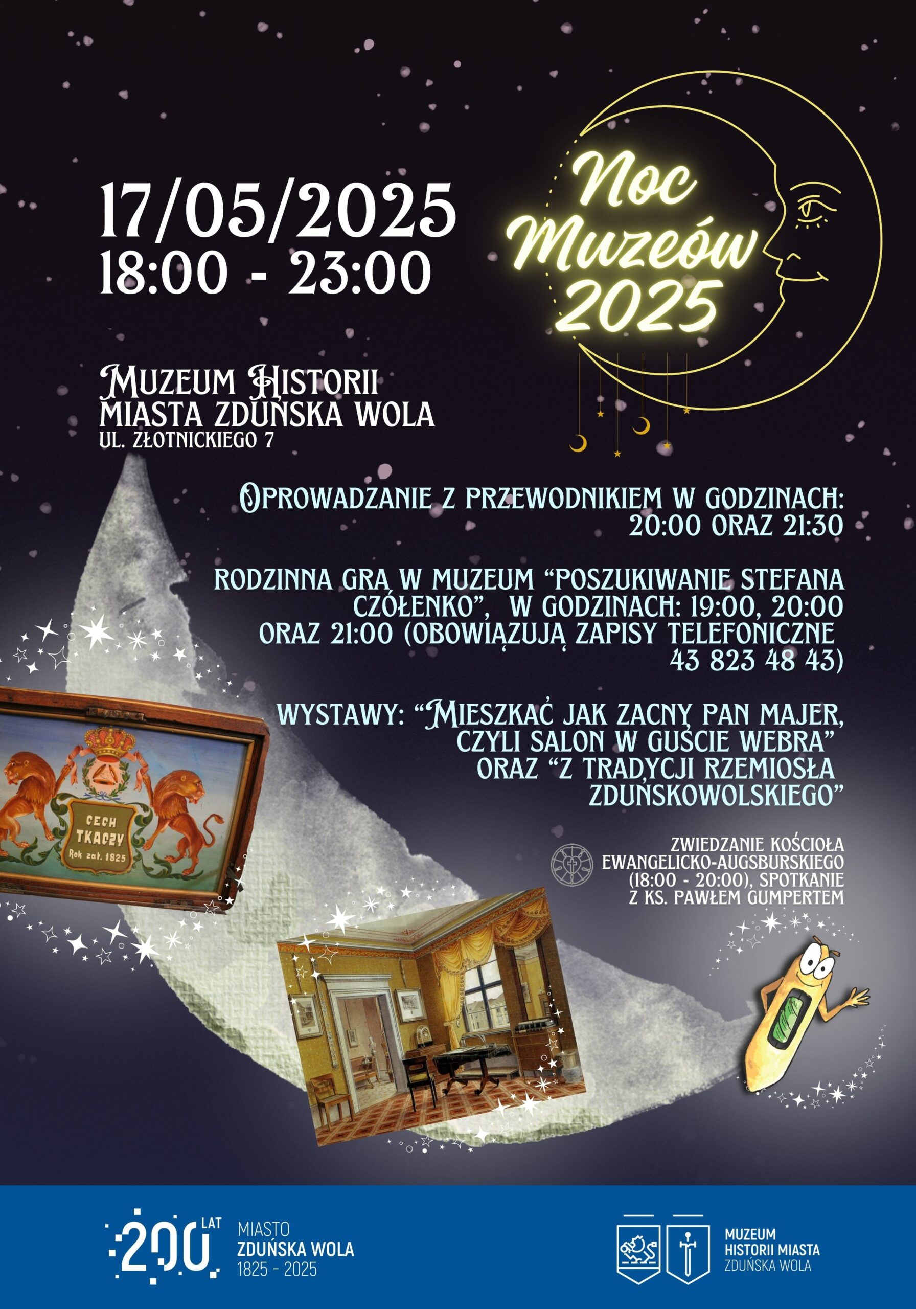 Będzie można też zagrać w rodzinną grę w muzeum o nazwie "Poszukiwanie Stefana Czółenko". Grupy do max. 10 os., dorosłych z dziećmi, w godzinach 19.00, 20.00 oraz 21.00 mogą rozwiązywać zagadki związane z historią Zduńskiej Woli, które doprowadzą ich do ukrytej postaci - Muzealnego Przewodnika, czyli czółenka o imieniu Stefan. Na grę obowiązują zapisy telefoniczne do muzeum.