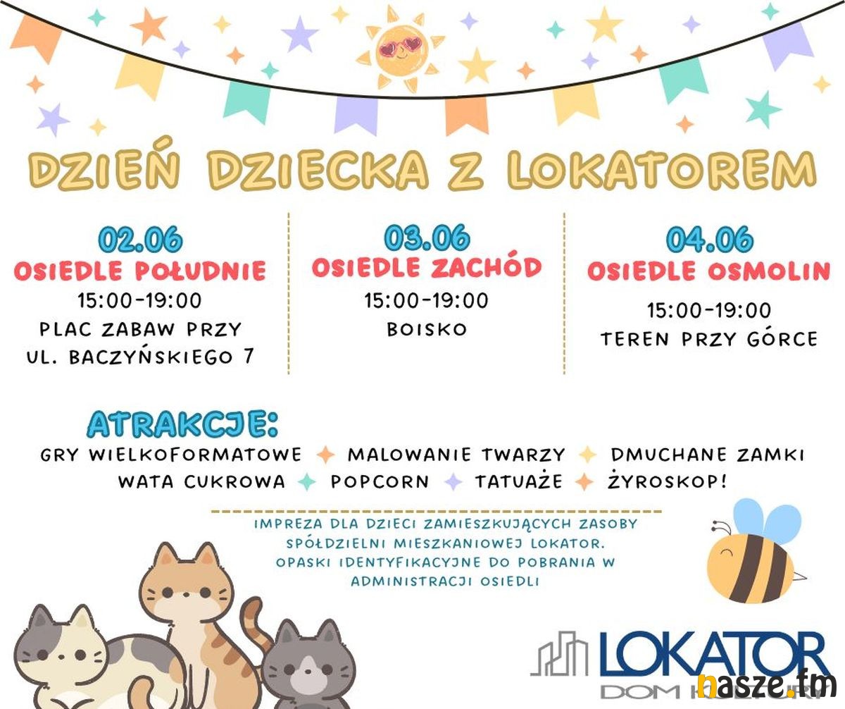 Lokator organizuje plenerowe zabawy dla dzieci ze spółdzielczych osiedli. Z okazji Dnia Dziecka spotkania odbędą się 2 czerwca na osiedlu Południe, 3 czerwca na osiedlu Zachód oraz 4 czerwca na osiedlu Osmolin. Opaski identyfikacyjne, które są biletem wstępu na teren imprezy są do odbioru w administracjach osiedli.