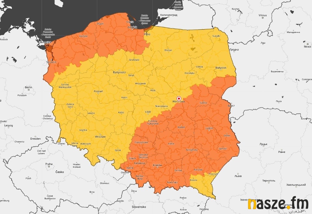Dla powiatów sieradzkiego, zduńskowolskiego i łaskiego, to ostrzeżenia najniższego, pierwszego stopnia. Na mapie poniżej kolorem żółtym zaznaczono obszar objęty tym ostrzeżeniem, pomarańczowym - drugiego.