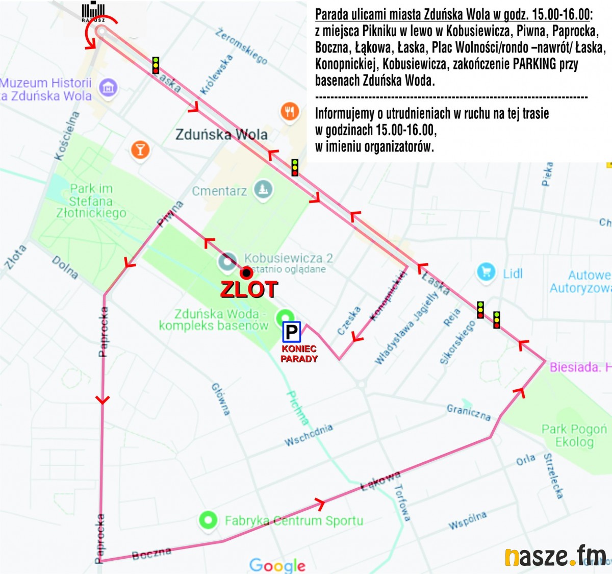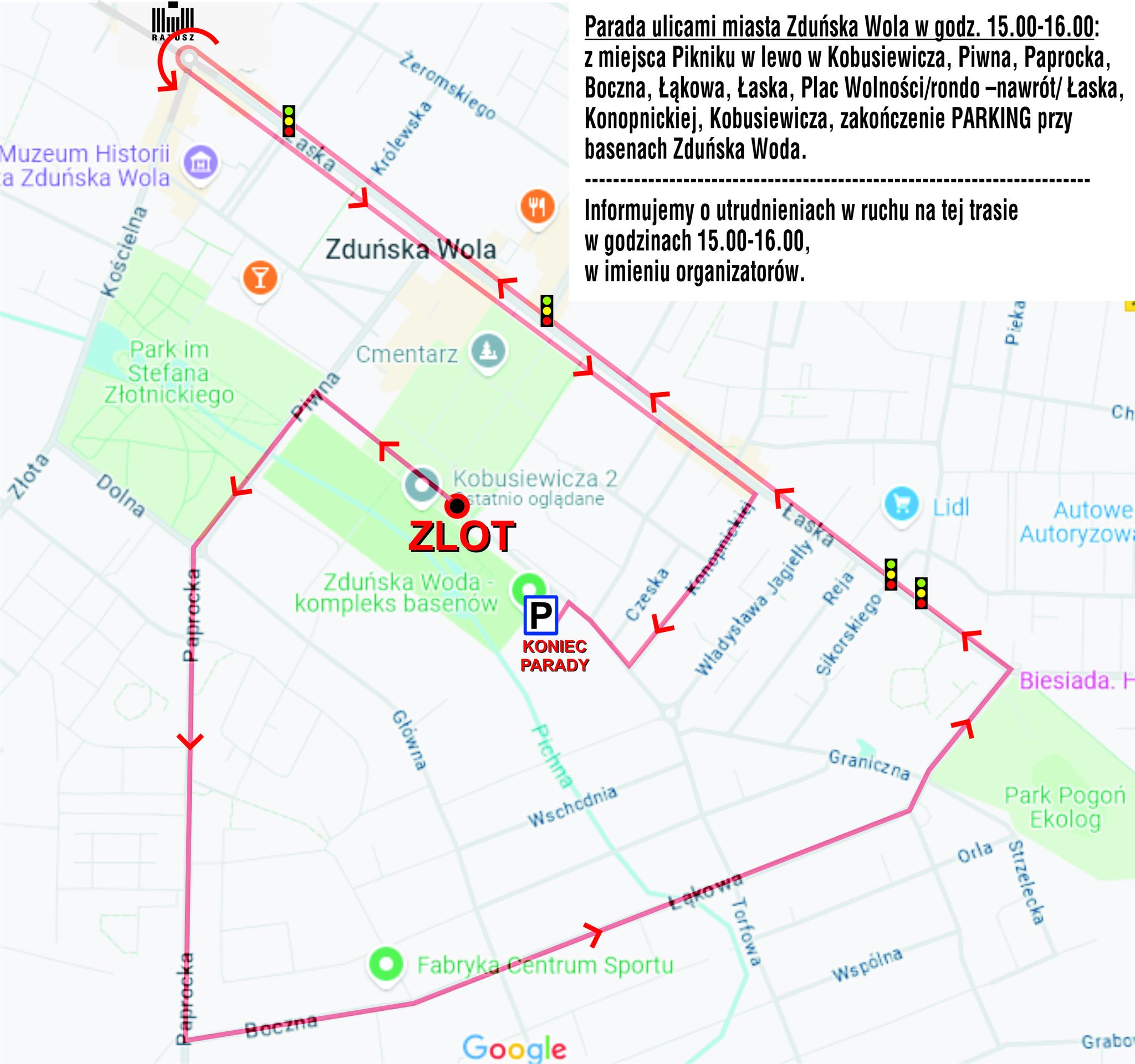 Trasa: z miejsca pikniku w lewo w ul. Kobusiewicza i dalej ul. Piwną, Paprocką, Boczną, Łąkową, Orione, Łaską, do placu Wolności/rondo (nawrót) i z powrotem Łaską, Konopnickiej, Kobusiewicza - zakończenie na parking przy basenach Zduńska Woda, gdzie przez około godzinę będzie można podziwiać wszystkie maszyny.
