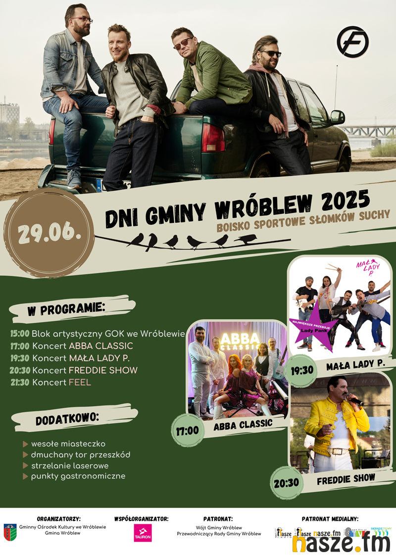 W programie część koncertowa: godz. 15:00 - blok artystyczny GOK we Wróblewie, godz. 17:00 - koncert ABBA CLASSIC, godz. 19:30 - koncert Mała Lady P., godz. 20:30 - koncert Freddie Show, godz. 21:30 - koncert Feel.