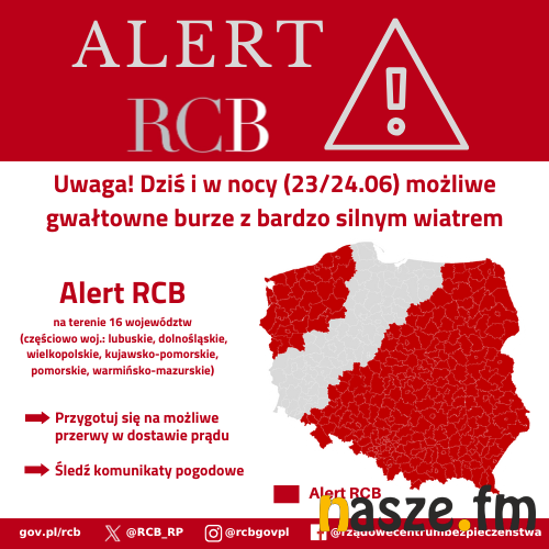 Przed prognozowanymi dla naszego regionu burzami i silnym wiatrem ostrzega także Rządowe Centrum Bezpieczeństwa: