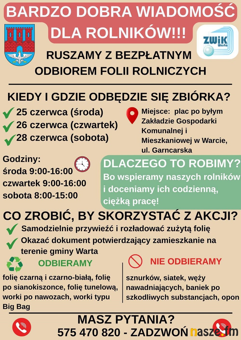Urząd Miejski w Warcie we współpracy z Zakładem Wodociągów i Kanalizacji w Warcie organizuje całkowicie bezpłatną zbiórkę folii rolniczych dla wszystkich mieszkańców gminy Warta. Odpady takie jak między innymi: folia czarna i czarno-biała, folia po sianokiszonce czy worki po nawozach można dostarczyć na plac po byłym zakładzie Gospodarki Komunalnej i Mieszkaniowej w Warcie dzisiaj do godziny 16 lub w sobotę od 8 do 15.