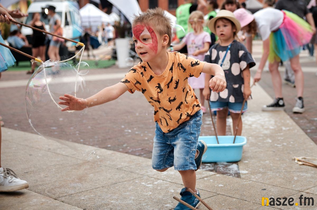 W niedzielę na rynku w Manufakturze bawiły się całe rodziny. Na dzieci czekała moc bezpłatnych atrakcji m.in. strzelnica z puszkami, w której można było wygrać gigantyczne maskotki, dmuchańce, warsztaty ludowe, pokazy baniek, malowanie buziek i brokatowych tatuaży. Były animacje oraz smaczne przekąski m.in. wata cukrowa, owoce w czekoladzie, frytki, churrosy, napoje i zakręcone ziemniaczki.