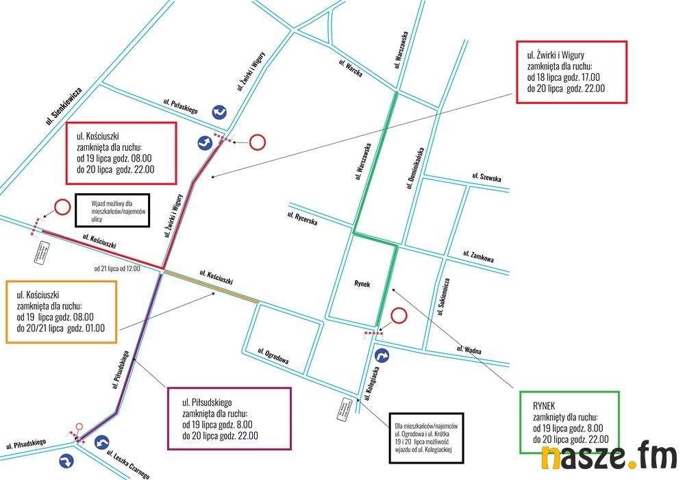 - ul. Żwirki i Wigury od skrzyżowania z ul. Kościuszki do skrzyżowania z - ul. Pułaskiego od 18.07 godz. 17.00 do 20.07 godz. 22.00