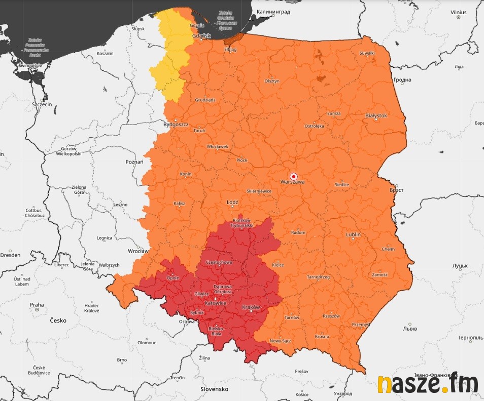 Na mapie poniżej kolorem czerwonym zaznaczono obszar naszego kraju objęty ostrzeżeniami najwyższego, trzeciego stopnia; pomarańczowym - drugiego a żółtym - najniższego, pierwszego.