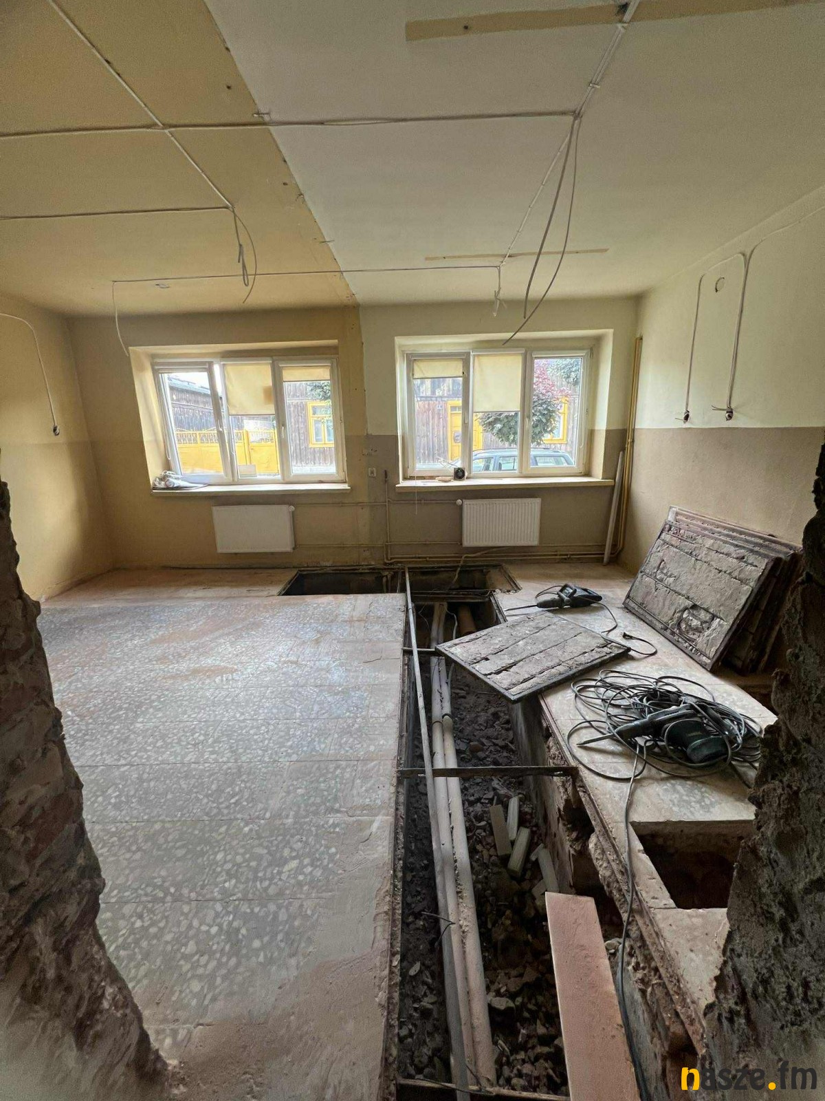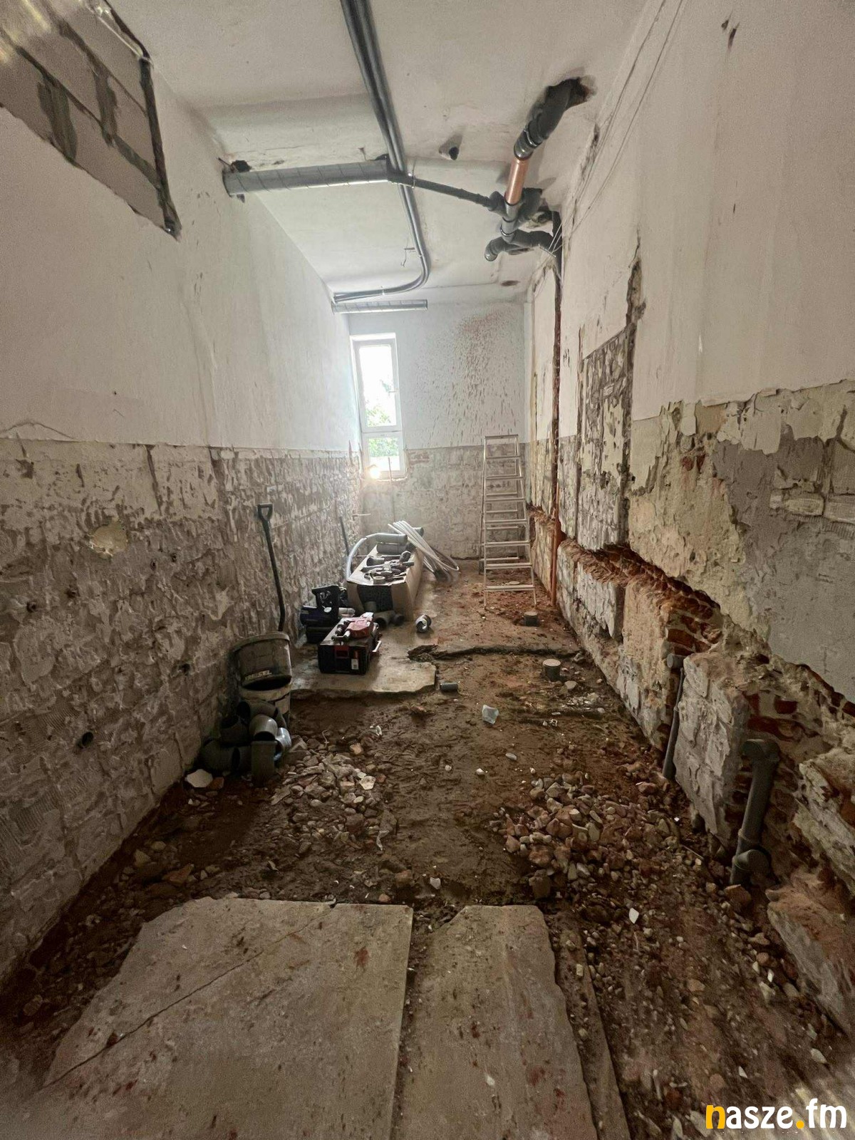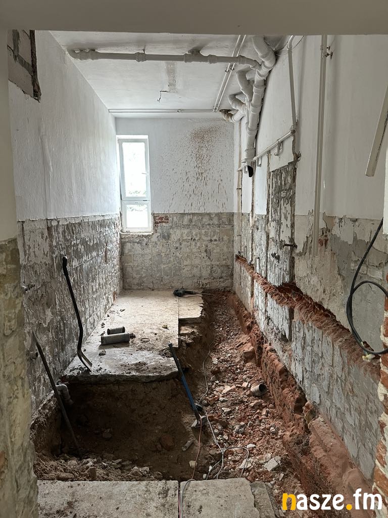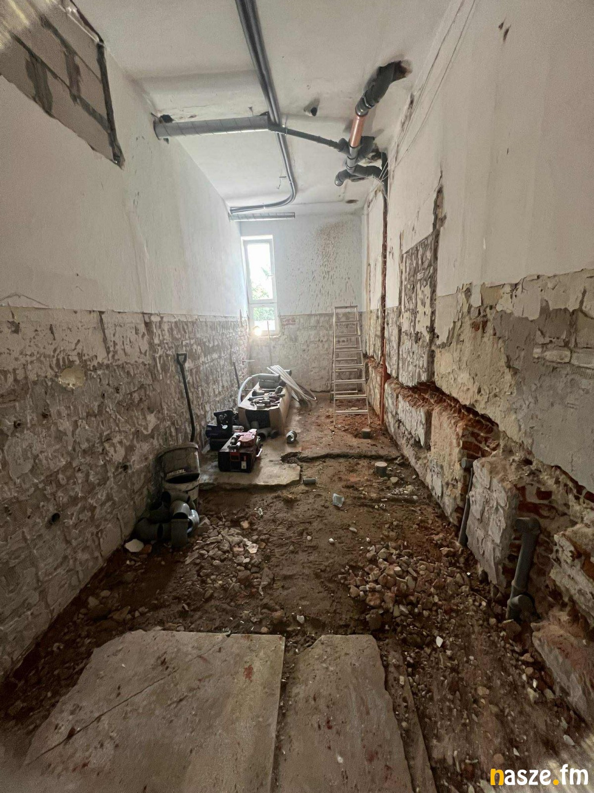 Aktualnie wykonano roboty demontażowe: skucie posadzek w pomieszczeniach objętych zakresem remontu, tj. w łazienkach na parterze, zapleczu kuchennym oraz salach lekcyjnych. Wymieniono instalacje sanitarne: przystąpiono do wymiany instalacji wodociągowej i kanalizacji sanitarnej w łazienkach na parterze, częściowo na piętrze oraz w zapleczu kuchennym.