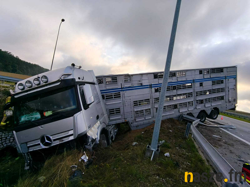 Poranne zdarzenie drogowe na węźle drogi ekspresowej S-8 Sieradz Wschód. Pojazd ciężarowy do przewozu zwierząt uderzył w osłonę energochłonną i wjechał do rowu.