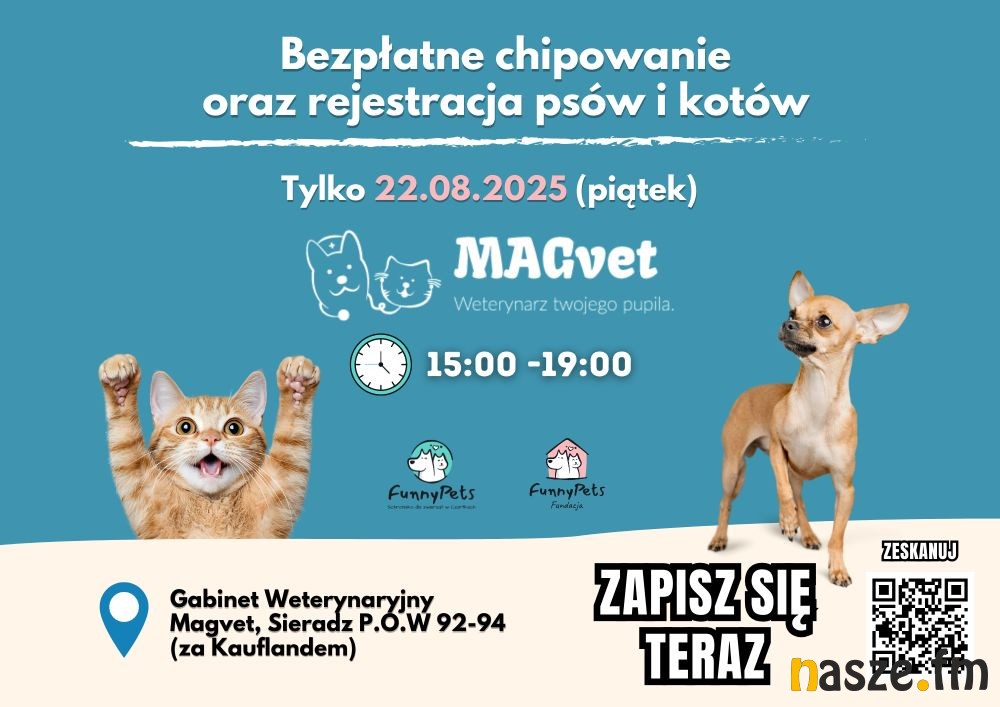 - Nasze schronisko działa już 15 lat i od samego początku chipujemy i rejestrujemy każde zwierzę, które do nas trafia. To dla nas mega ważne, bo dzięki chipom wiele psiaków i kotów mogło wrócić do swoich domów. Od 5 lat działa też nasza Fundacja, która pomaga nam rozwijać te działania, edukować i docierać do większej liczby osób. Tym razem z Gabinetem Weterynaryjnym Magvet, robimy coś naprawdę fajnego, chcemy, żeby każdy pupil w naszym regionie miał szansę na trwałą identyfikację bez żadnych kosztów. Podczas akcji będzie też okazja, żeby z nami pogadać o adopcjach, odpowiedzialnej opiece nad zwierzętami, będzie też chwila, by porozmawiać z zespołem medycznym, jeśli będziecie potrzebowali doradztwa w temacie zdrowia Waszego pupila. Będzie nam bardzo miło, jeśli wpadniecie z Waszymi zwierzakami – zadbamy razem o ich bezpieczeństwo, a przy okazji będzie to świetna okazja, żeby się poznać i porozmawiać. Do zobaczenia 22 sierpnia w Magvet w Sieradzu, przy ulicy P.O.W 92/94. – mówi Patrycja Bednarek ze Schroniska Funny Pets w Czartkach.