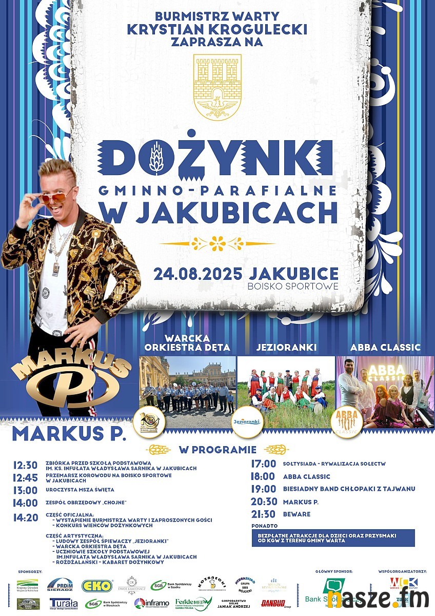 Dziś, 24 sierpnia, za tegoroczne plony podziękują rolnicy z Gminy Warta. Dożynki Gminno-Parafialne odbędą się w Jakubicach. Jak zwykle nie zabraknie konkursu na najpiękniejszy wieniec dożynkowy, pysznego jedzenia i części artystycznej. Gwiazdą wieczoru będzie Marcus P.