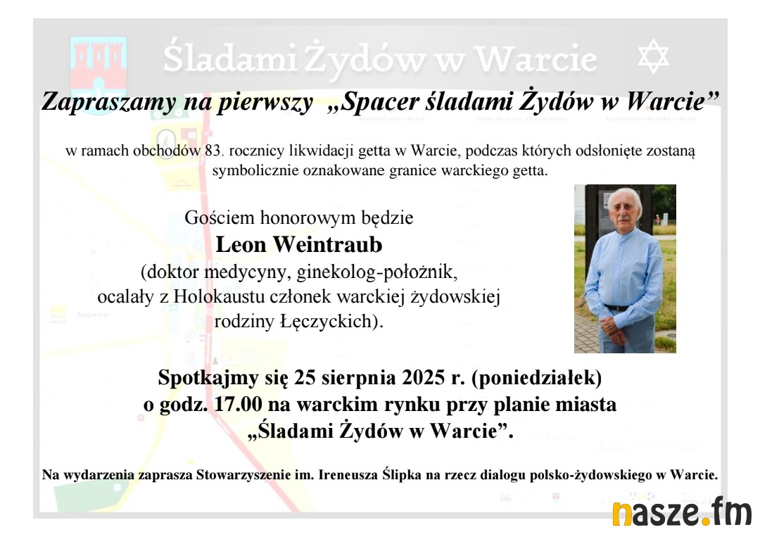 Uroczystości rozpoczną się o godz. 17:00 na rynku. Gościom honorowym będzie Leon Weitraub, doktor medycyny, ginekolog - położnik, ocalały z Holokaustu członek warckiej, żydowskiej rodziny Łęczyckich. Na wydarzenie zaprasza Stowarzyszenie im. Ireneusza Ślipka w Warcie.