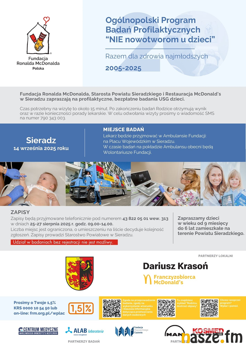 Badania prowadzone są w ramach programu "NIE nowotworom u dzieci" i obejmują dzieci w wieku od 9 miesięcy do 6 lat. Do badania będą mogły podejść wyłącznie dzieci zgłoszone telefonicznie w dniach 25-27 sierpnia 2025 r. Rejestracja odbywać się będzie telefonicznie pod numerem: 43 822 05 01 wew. 313 (Starostwo Powiatowe w Sieradzu). Prosimy przygotować nr PESEL dziecka.