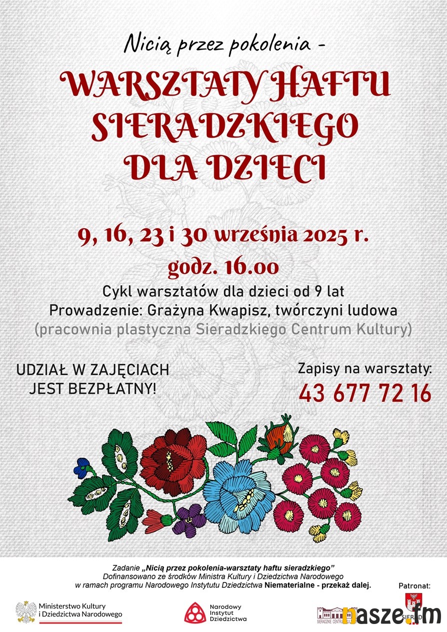 Hafciarstwo i haft sieradzki zostały wpisane w tym roku na "Listę niematerialnego dziedzictwa kulturowego". Podczas zajęć dzieci będą wyszywać na płóciennych torbach prosty wzór kolorowego haftu płaskiego, charakterystyczny dla naszego regionu. W warsztatach mogą wziąć udział dzieci od 9 roku życia i młodzież.