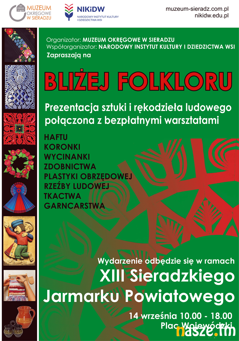 Muzeum Okręgowe w Sieradzu zaprasza również na wydarzenie zorganizowane w ramach XIII SIERADZKIEGO JARMARKU POWIATOWEGO: BLIŻEJ FOLKLORU. 14.09.2025 w godz. 10:00 - 18:00. Podczas wydarzenia odbędzie się prezentacja sztuki i rękodzieła ludowego połączona z bezpłatnymi warsztatami. Organizatorem wydarzenia jest Muzeum Okręgowe w Sieradzu a współorganizatorem - Narodowy Instytut Kultury i Dziedzictwa Wsi.