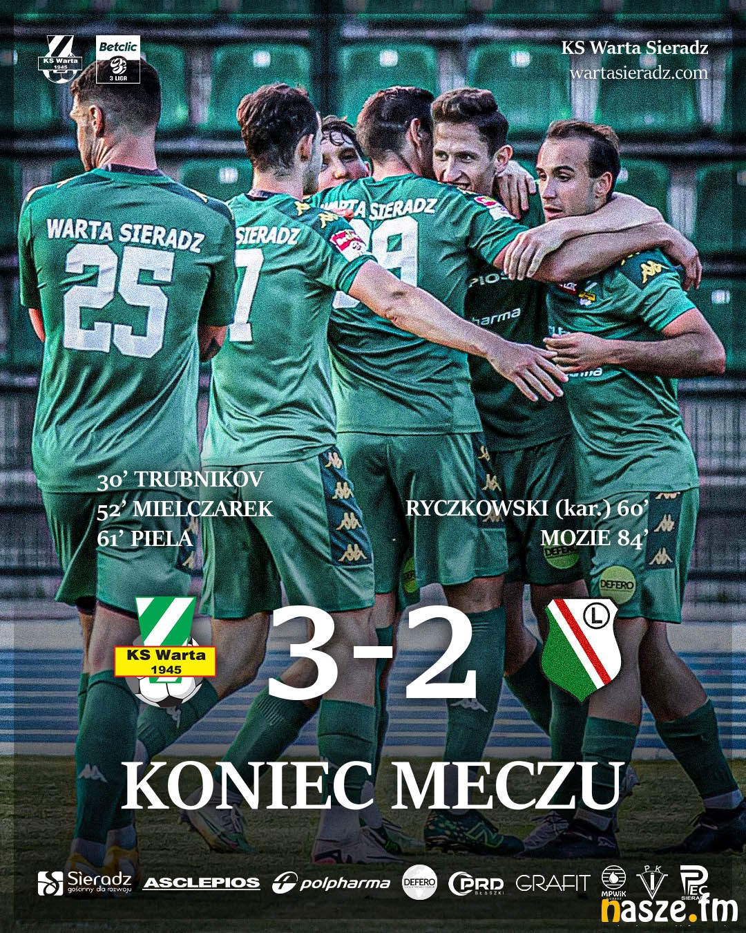 Czwarte z rzędu zwycięstwo Warty Sieradz w III lidze. Tym razem Biało-Zieloni wygrali na swoim stadionie z rezerwami Legii Warszawa 3:2. Sieradzanie pozostają na znakomitym, trzecim miejscu w tabeli.