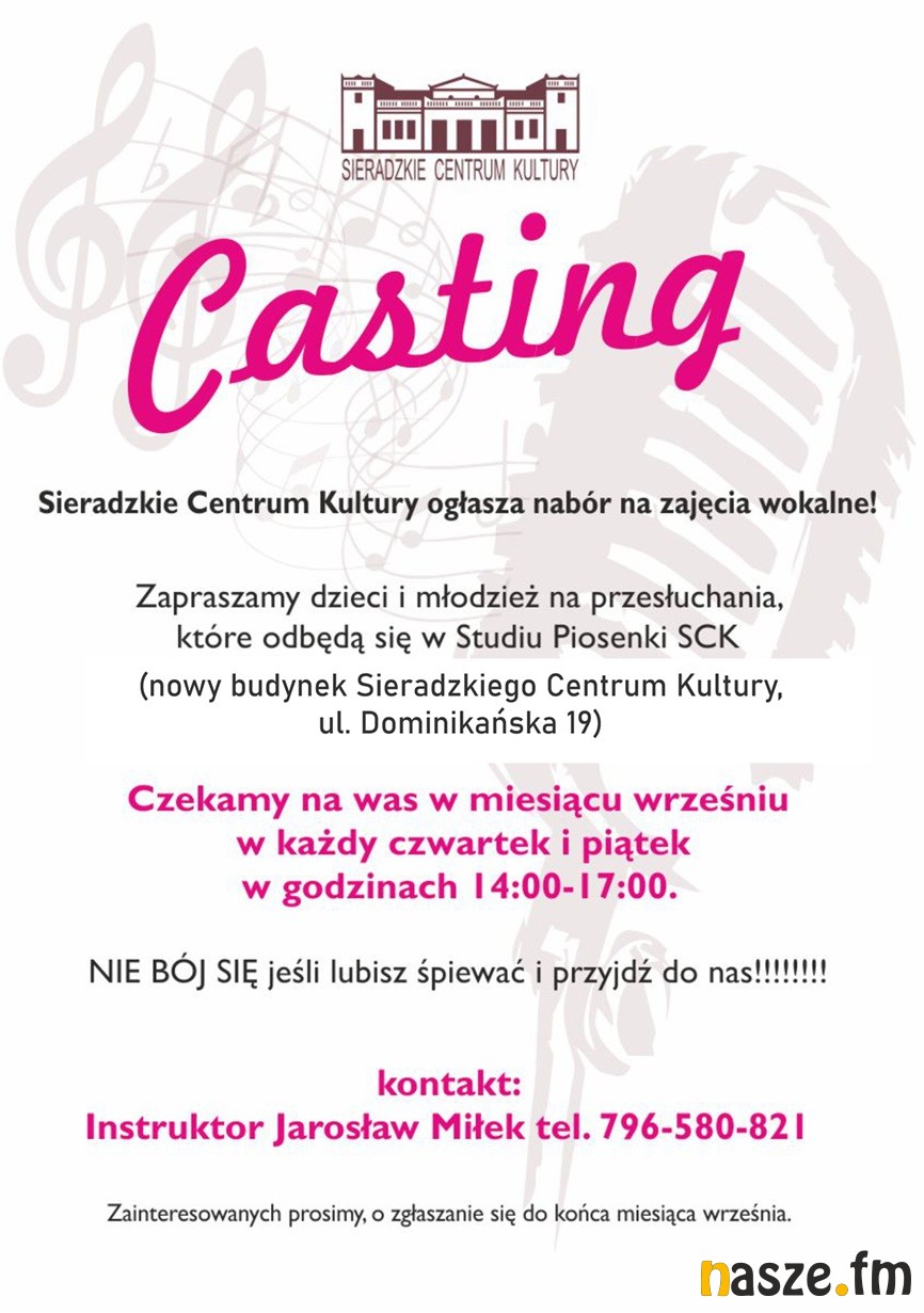 Przesłuchania odbędą się w "Studiu piosenki" w nowym budynku SCKu przy ul. Dominikańskiej 19. Rozpoczną się o godz. 14:00 i potrwają do 17:00. Zajęcia wokalne poprowadzi znany i ceniony instruktor Jarosław Miłek.