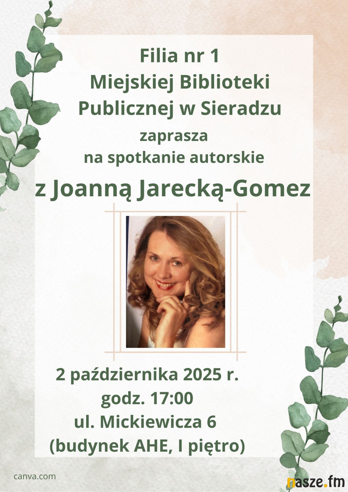 Spotkanie z Joanną Jarecką - Gomez zaplanowano na godz. 17:00 w czytelni Filii nr 1 MBP w Sieradzu przy ul. Mickiewicza ( budynek AHE, I piętro). Na spotkaniu będzie można zakupić książki autorki i otrzymać autograf.