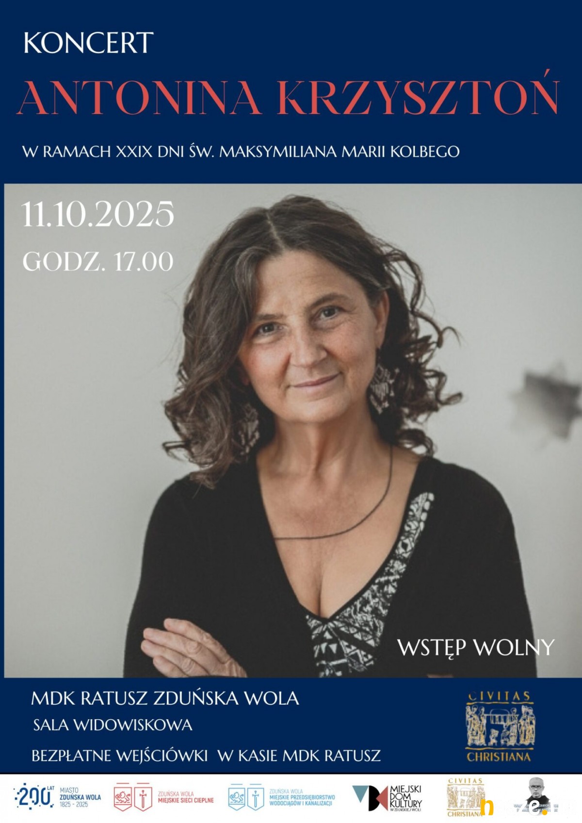 Antonina Krzysztoń polska pieśniarka, kompozytorka, autorka tekstów wystąpi w Miejskim Domu Kultury Ratusz. Koncert odbędzie się w ramach XXIX Dni Św. Maksymiliana Marii Kolbego.