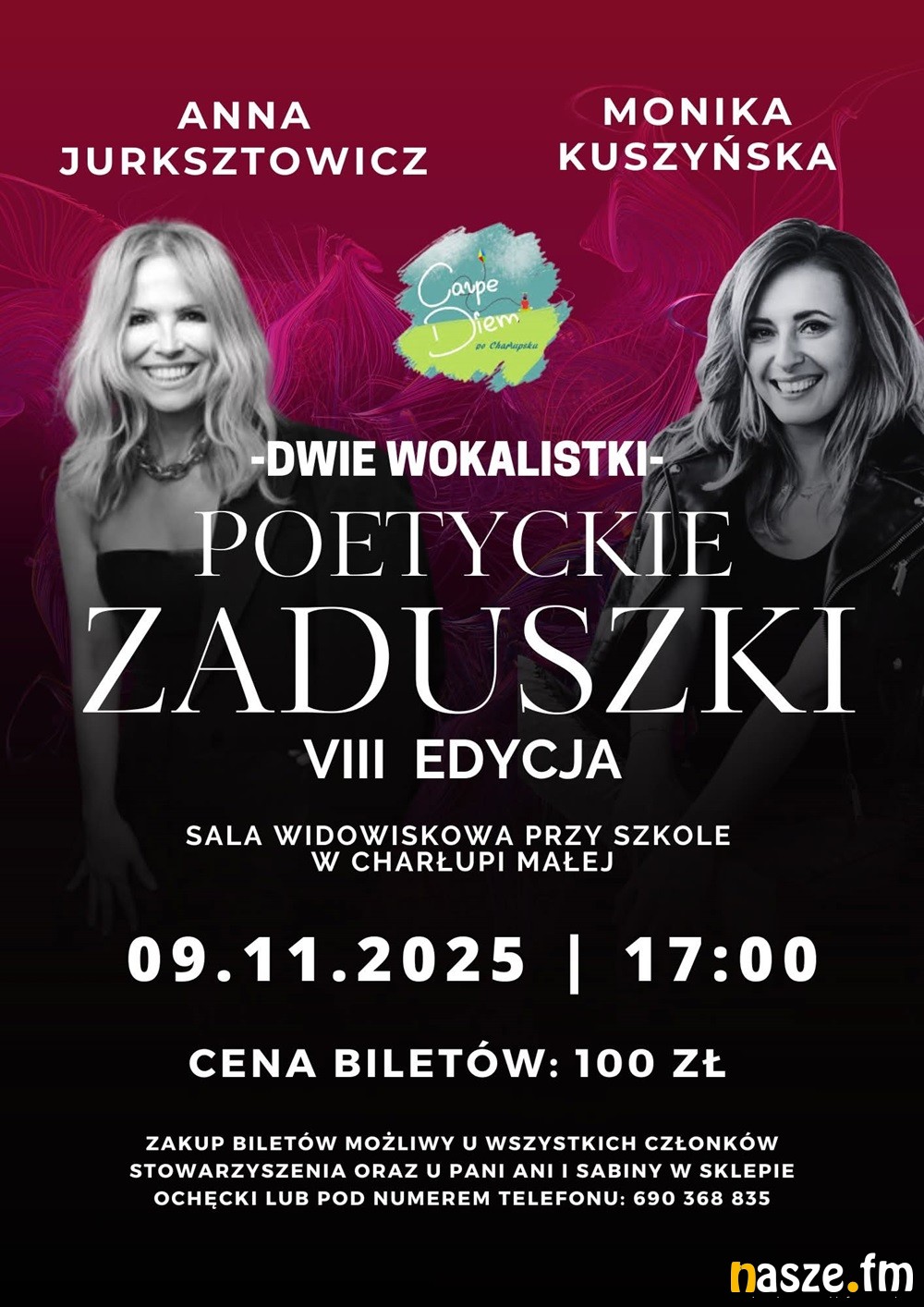 Stowarzyszenie Carpe Diem po Charłupsku zaprasza 9 listopada na VIII edycję Poetyckich Zaduszek w hali sportowo widowiskowej przy Szkole Podstawowej w Charłupi Małej. Koncert Galowy jak zawsze składa się z dwóch części. W pierwszej występuje utalentowana młodzież regionu sieradzkiego. W tym roku wystąpi Tymon Kubiczak uczeń Szkoły Podstawowej w Jakubicach. W drugiej znani artyści polskiej sceny muzycznej. Tym razem na scenie dwie Wokalistki: Monika Kuszyńska i Anna Jurksztowicz.