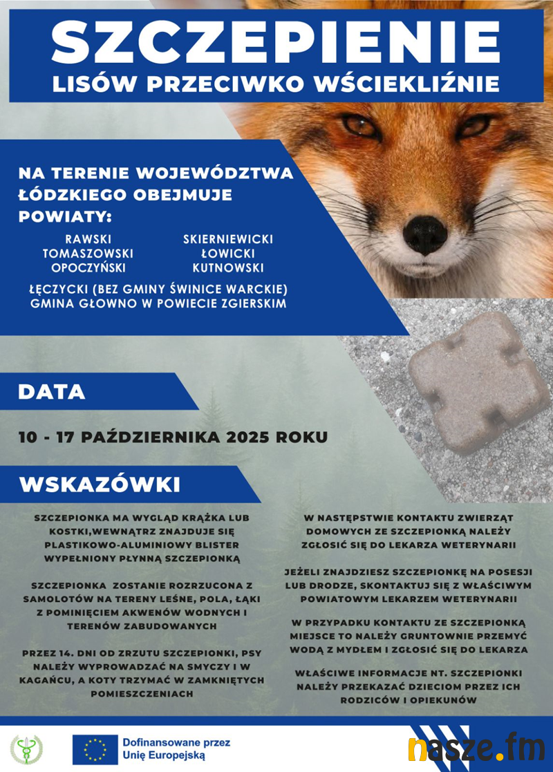 Otrzymujecie dziś zapewne alerty RCB o zrzutach w lasach szczepionki przeciwko wściekliźnie lisów. Samolotowe zrzuty mają ruszyć jutro i potrwać siedem dni. RCB apeluje, by w tym czasie nie wchodzić do lasów, ale jak ustaliło Nasze Radio akcja ta nie dotyczy obszarów powiatów sieradzkiego, zduńskowolskiego i łaskiego.