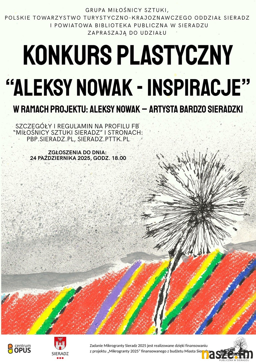 Ten konkurs ma upamiętnić artystę związanego przez lata z Sieradzem. Choć Aleksy Nowak nie urodził się w tym mieście, to tu postanowił żyć i tworzyć. Mogą wziąć w nim udział uczniowie szkół średnich i dorośli, żeby to zrobić powinni wykonać pracę plastyczną inspirowaną twórczością Aleksego Nowaka. Organizatorzy czekają na zgłoszenia do końca października.