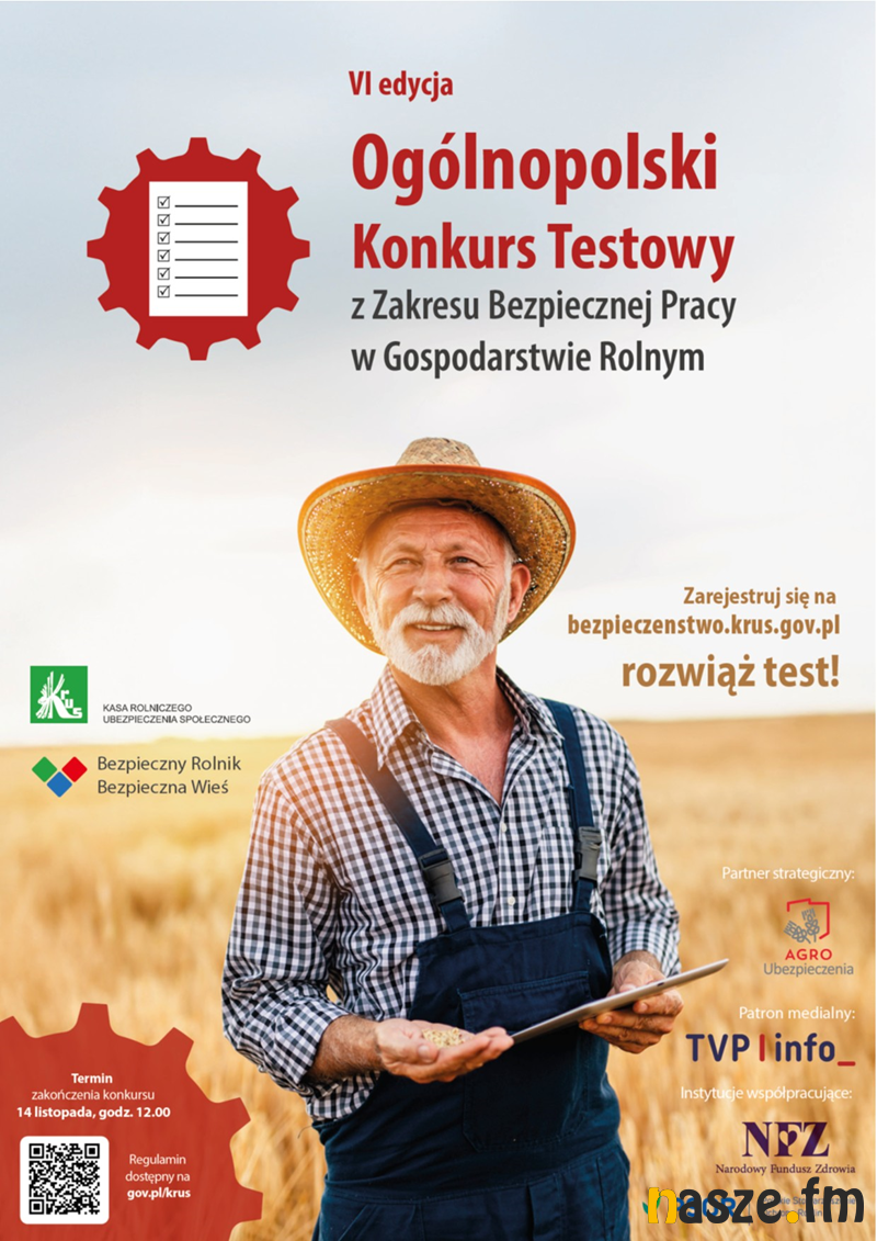 Zapraszamy do udziału w VI Ogólnopolskim Konkursie Testowym z Zakresu Bezpiecznej Pracy w Gospodarstwie Rolnym "Bezpieczny Rolnik, Bezpieczna Wieś". W konkursie mogą wziąć udział osoby podlegające ubezpieczeniu społecznemu rolników.