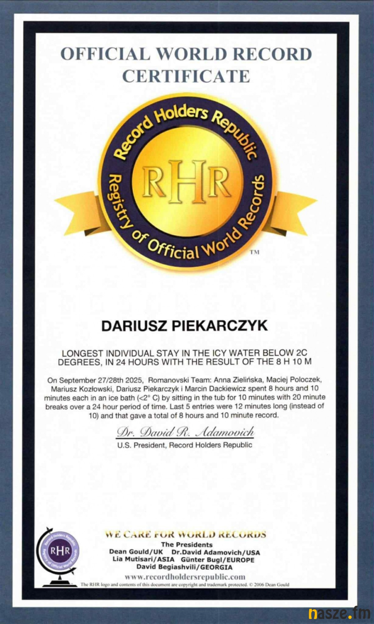 Zduńskowolanin Dariusz Piekarczyk został rekordzistą świata w 24-godzinnej sztafecie przebywania w lodowatej wodzie. Zduńskowolanin, wraz z grupą przyjaciół, uzyskał wynik 8 godzin i 10 minut. Tym samym zdobył certyfikat rekordzisty świata.