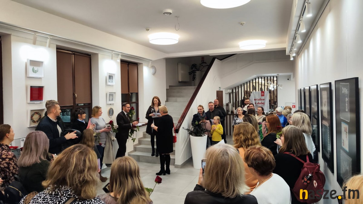 Następnie przenieśli się do Galerii Teatr, gdzie czekała wystawa prac, a każdy z uczestników otrzymał dyplom z podziękowaniem oraz czerwoną różę, jako symbol najbardziej znanego motywu haftu sieradzkiego.