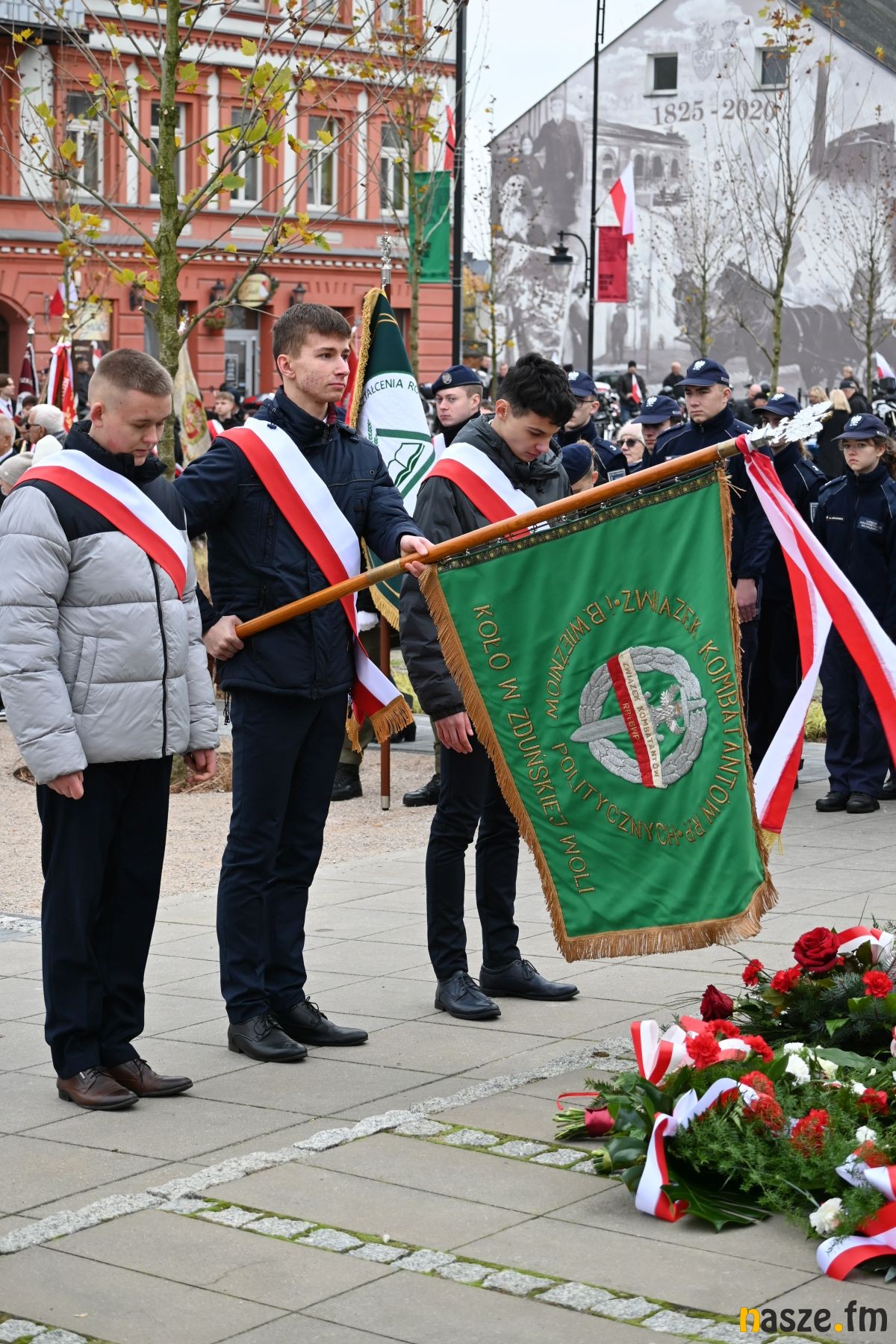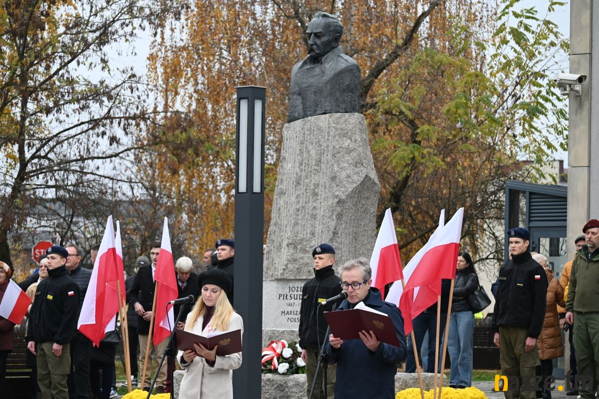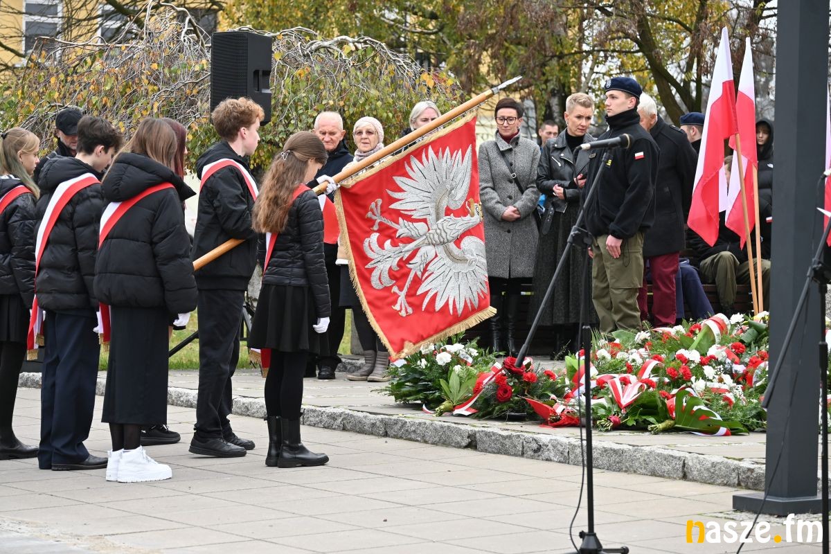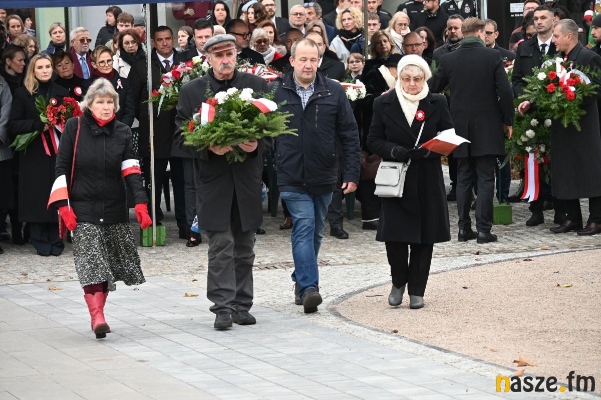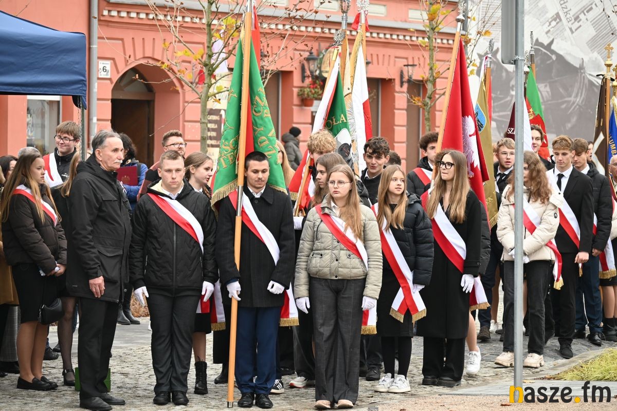 Po nabożeństwie, w rytmie marszowej muzyki, uczestnicy udali się na plac Wolności. Tam, przy pomniku Marszałka Józefa Piłsudskiego, odbyła się oficjalna część uroczystości. Był hymn państwowy, przemówienia, i podniosły moment złożenia kwiatów przez liczne delegacje. Uczniowie pierwszych klas Zespołu Szkół im. Kazimierza Kałużewskiego i Juliusza Sylli złożyli uroczyste ślubowanie na sztandar szkoły. Swoim występem wydarzenie uświetnili młodzi artyści z Powiatowego Młodzieżowego Domu Kultury "Na pięterku".