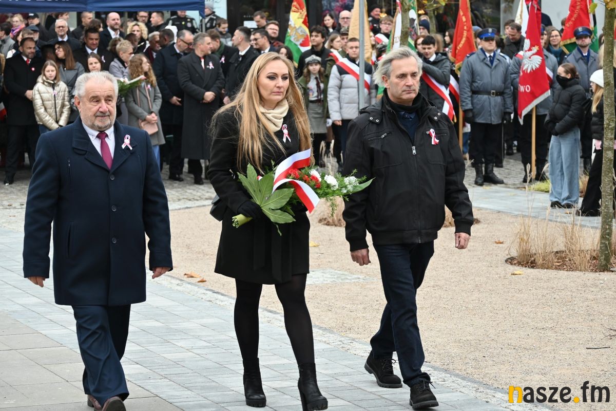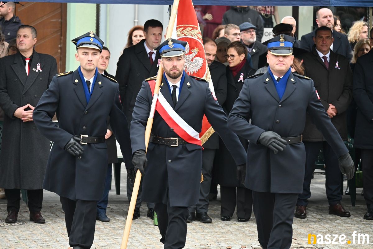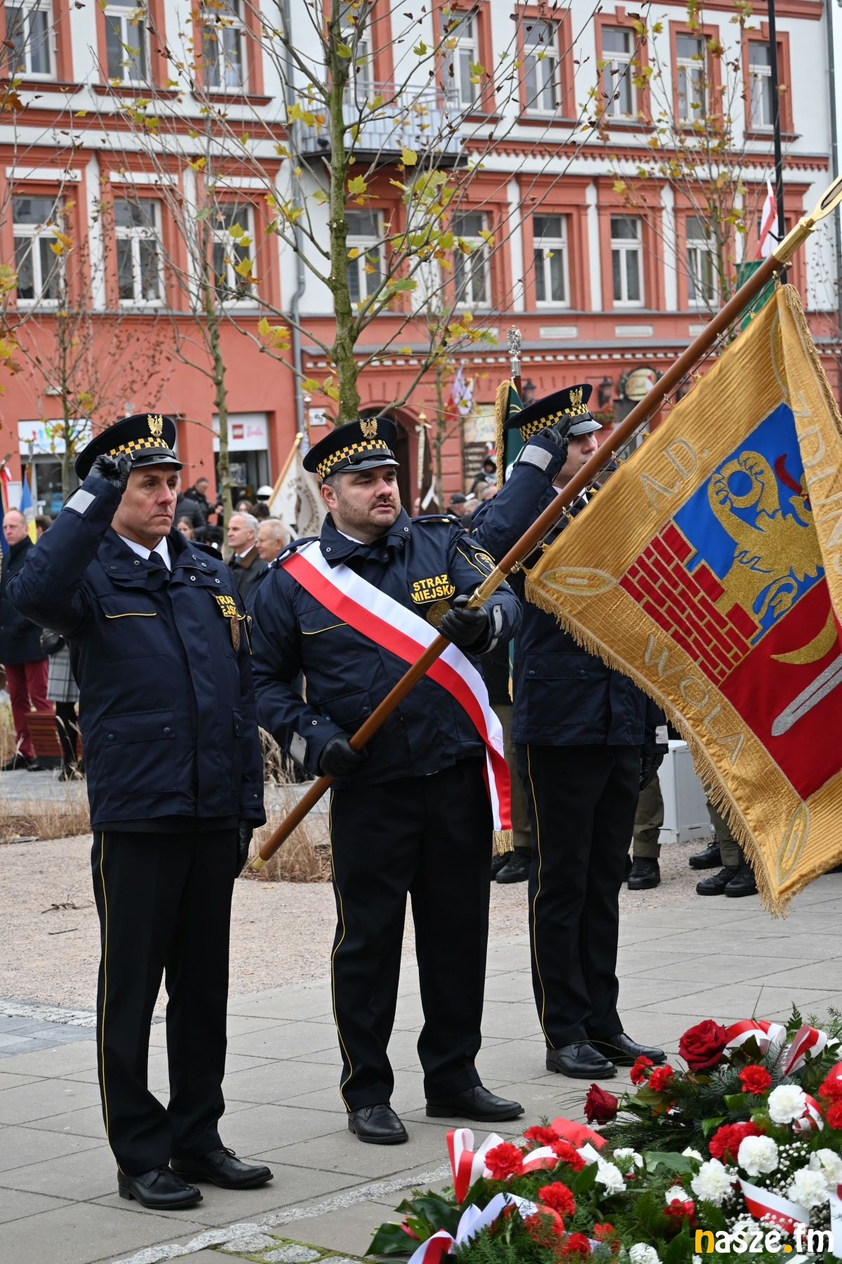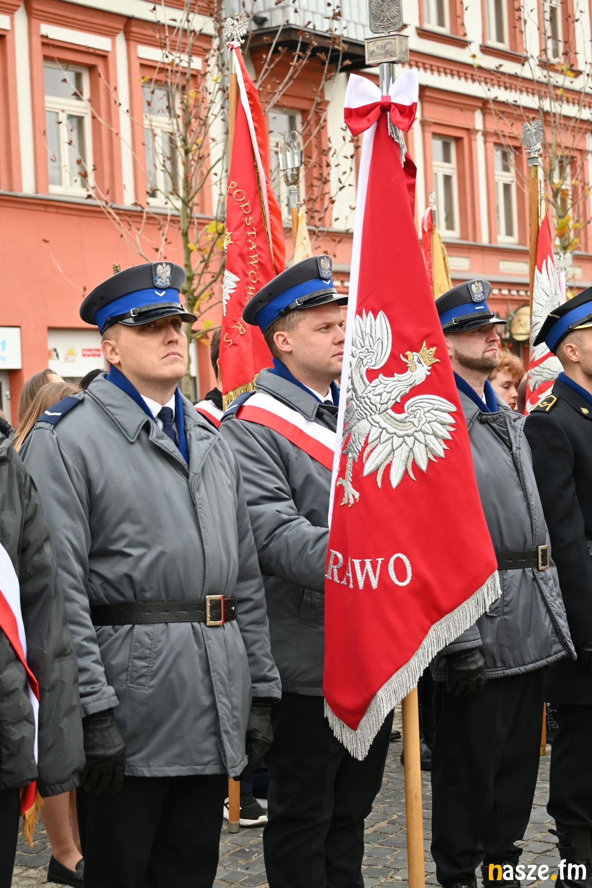 Po nabożeństwie, w rytmie marszowej muzyki, uczestnicy udali się na plac Wolności. Tam, przy pomniku Marszałka Józefa Piłsudskiego, odbyła się oficjalna część uroczystości. Był hymn państwowy, przemówienia, i podniosły moment złożenia kwiatów przez liczne delegacje. Uczniowie pierwszych klas Zespołu Szkół im. Kazimierza Kałużewskiego i Juliusza Sylli złożyli uroczyste ślubowanie na sztandar szkoły. Swoim występem wydarzenie uświetnili młodzi artyści z Powiatowego Młodzieżowego Domu Kultury "Na pięterku".