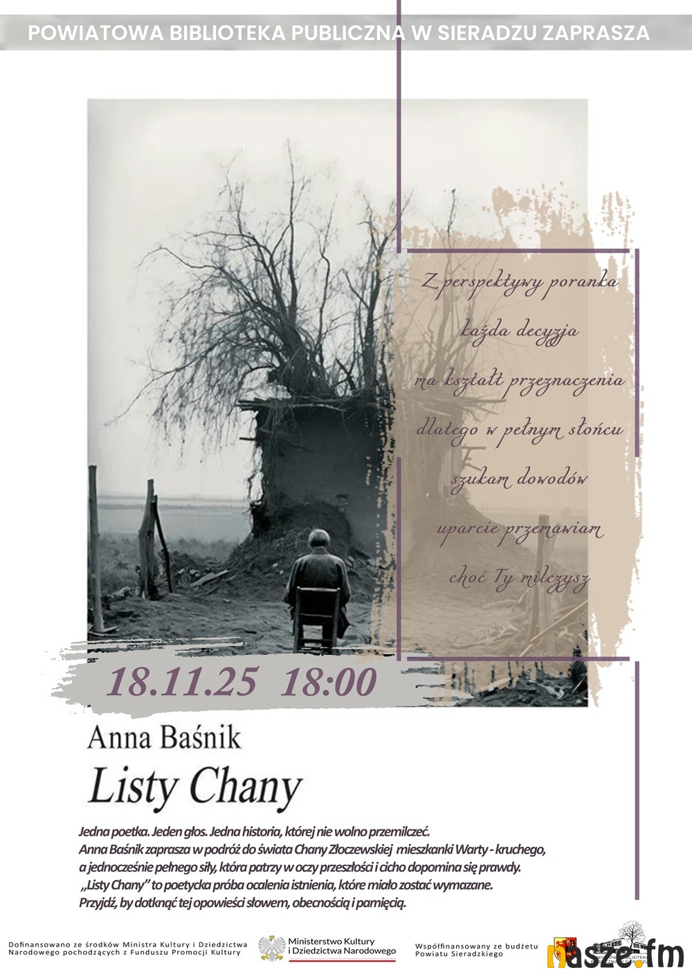 To poezja, która nie tylko opowiada historię, ale także ocala ją z ciszy. To słowa, które próbują dotrzeć tam, gdzie nikt już nie odpowiada. To spotkanie z pamięcią, wrażliwością i niezwykłą siłą słowa. Na spotkaniu będzie można usłyszeć, jak literatura potrafi przywracać imię i obecność oraz poznać autorkę, która z czułością i odwagą pochyla się nad losem tych, którzy zamilkli zbyt wcześnie. Będzie to wieczór pełen refleksji, bliskości i ciszy, która - dzięki poezji - zaczyna mówić.