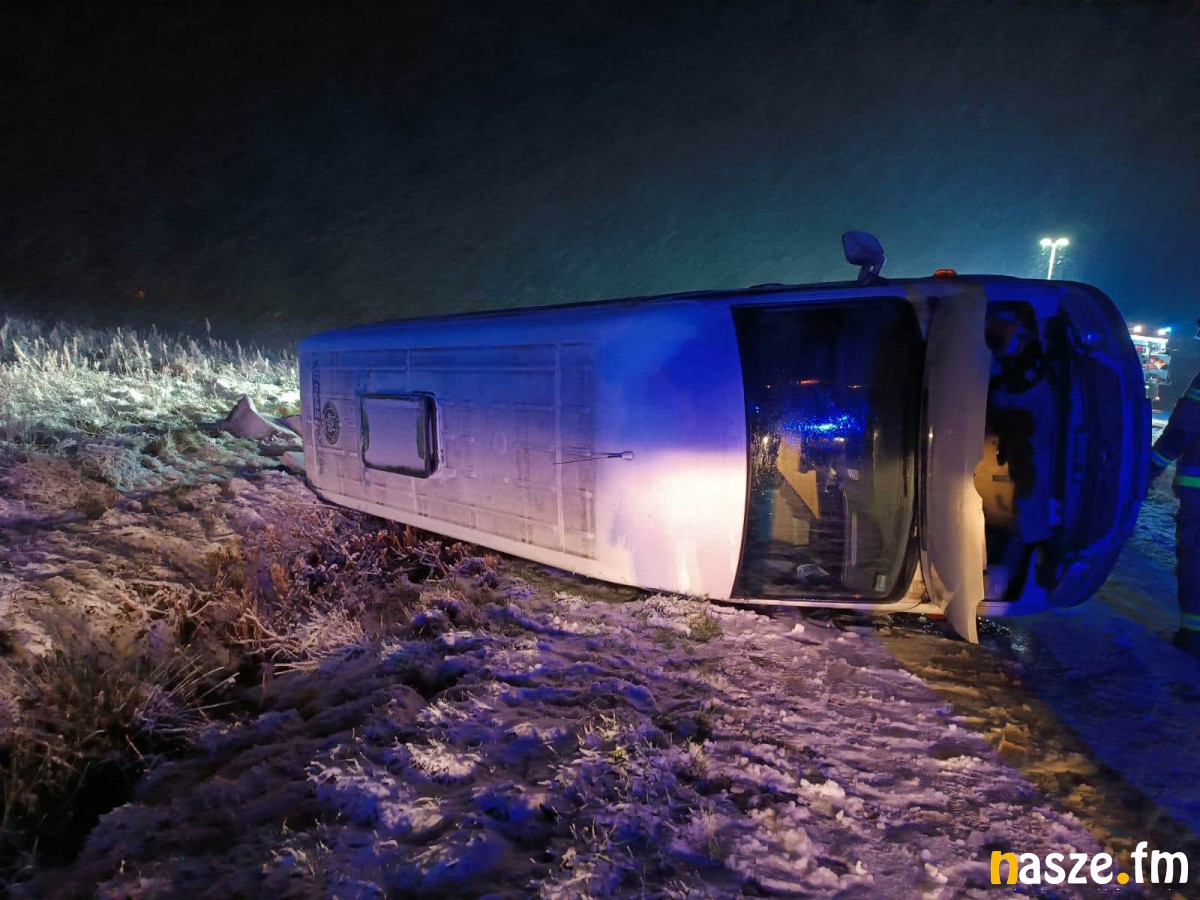 Bus z 12 pasażerami wpadł w poślizg i przewrócił się na bok