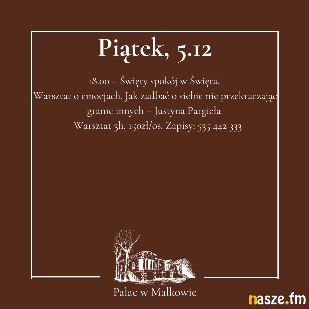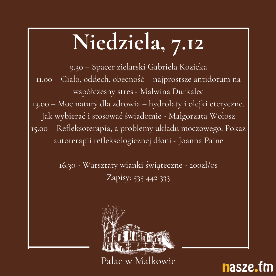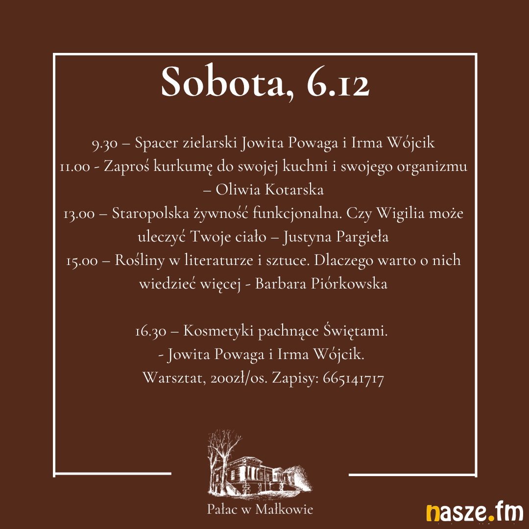 - Serdecznie zapraszam na kolejną odsłonę "Spotkania ze zdrowiem". Tym razem będzie to edycja zimowa, już około świąteczna. Będą wykłady, będzie kiermasz. A same wykłady to będzie ogrom wiedzy o zdrowiu, naturoterapii, o emocjach. Zaczniemy w piątek warsztatem tonizującym emocje związane ze świętami z Justyną Pargieła, a zakończymy warsztatem magicznych wianków świątecznych - zapowiada Agnieszka Kudlik-Budzińska, właścicielka pałacu w Małkowie.